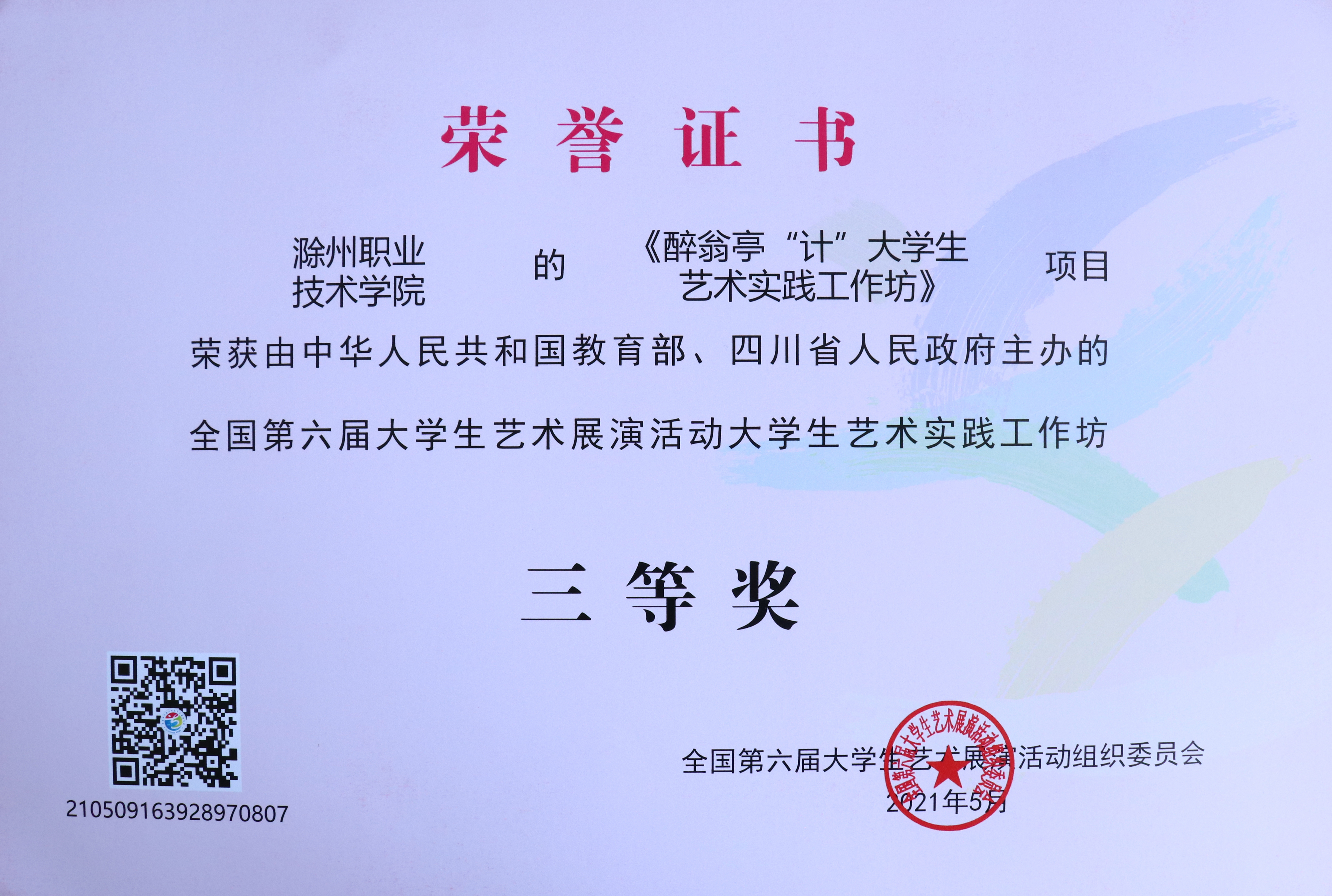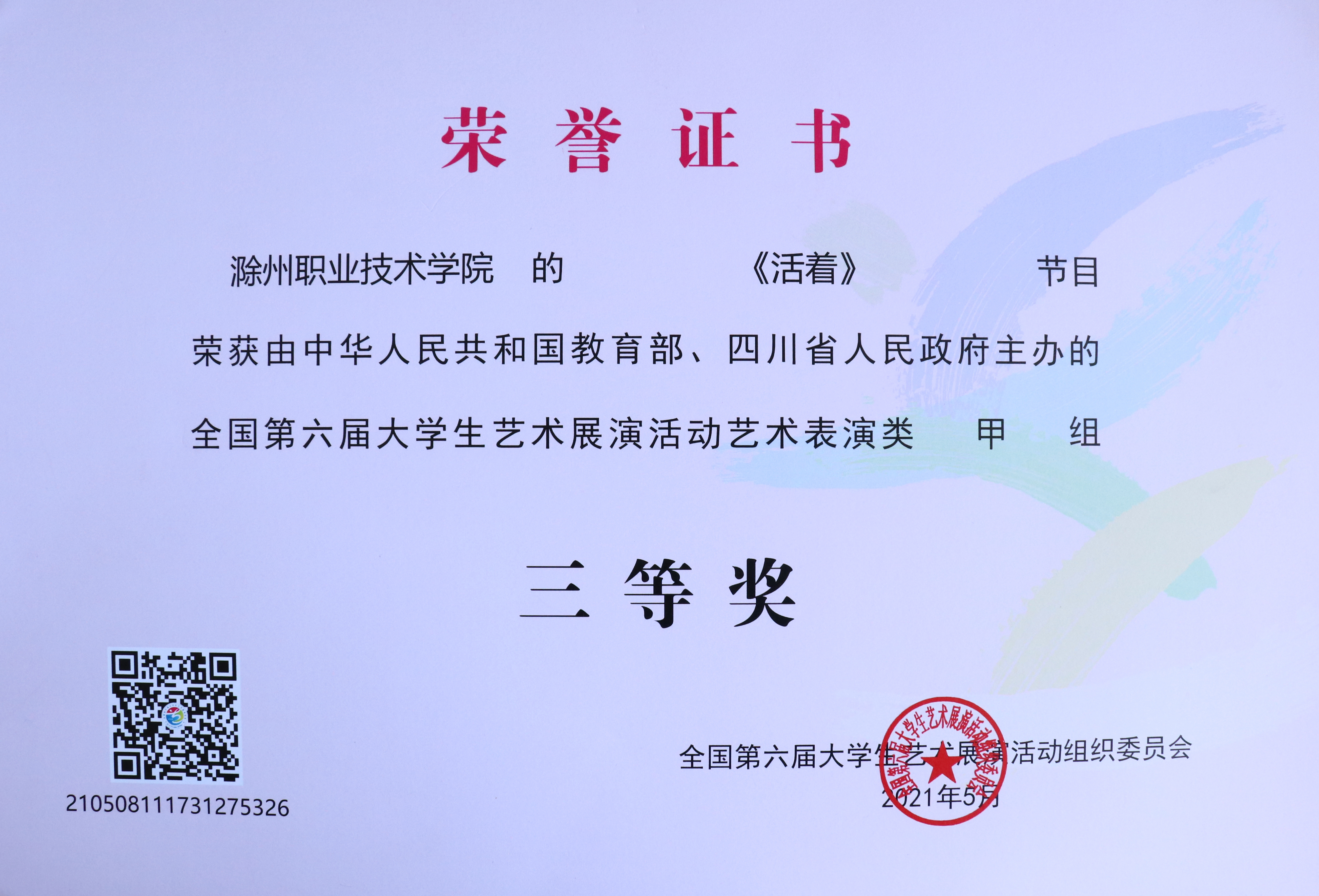近日,全国第六届大学生艺术展演活动评选结果揭晓,金沙威尼斯官网入围国赛的2件作品荣获三等奖,学校荣获全省优秀组织奖,实现在该项赛事的历史性突破。