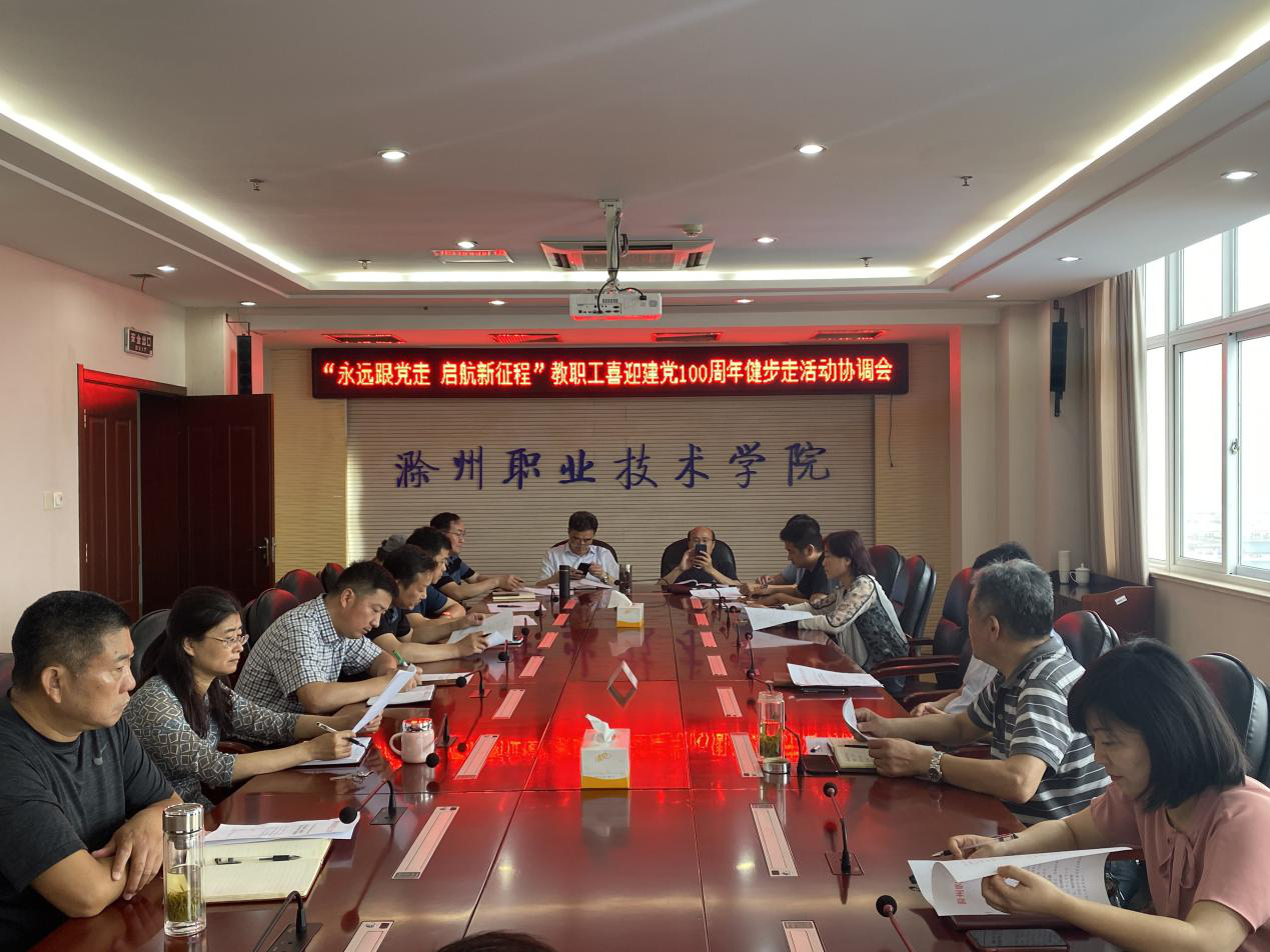 6月10日上午,金沙威尼斯官网在综合楼904会议室召开“永远跟党走 启航新征程”教职工喜迎建党100周年健步走活动协调会。校党委副书记杨家庆、各二级学院党总支书记、相关部门负责人、校工会全体人员及各分工会主席参加会议。会议由党委委员、工会主席陈学军主持。
