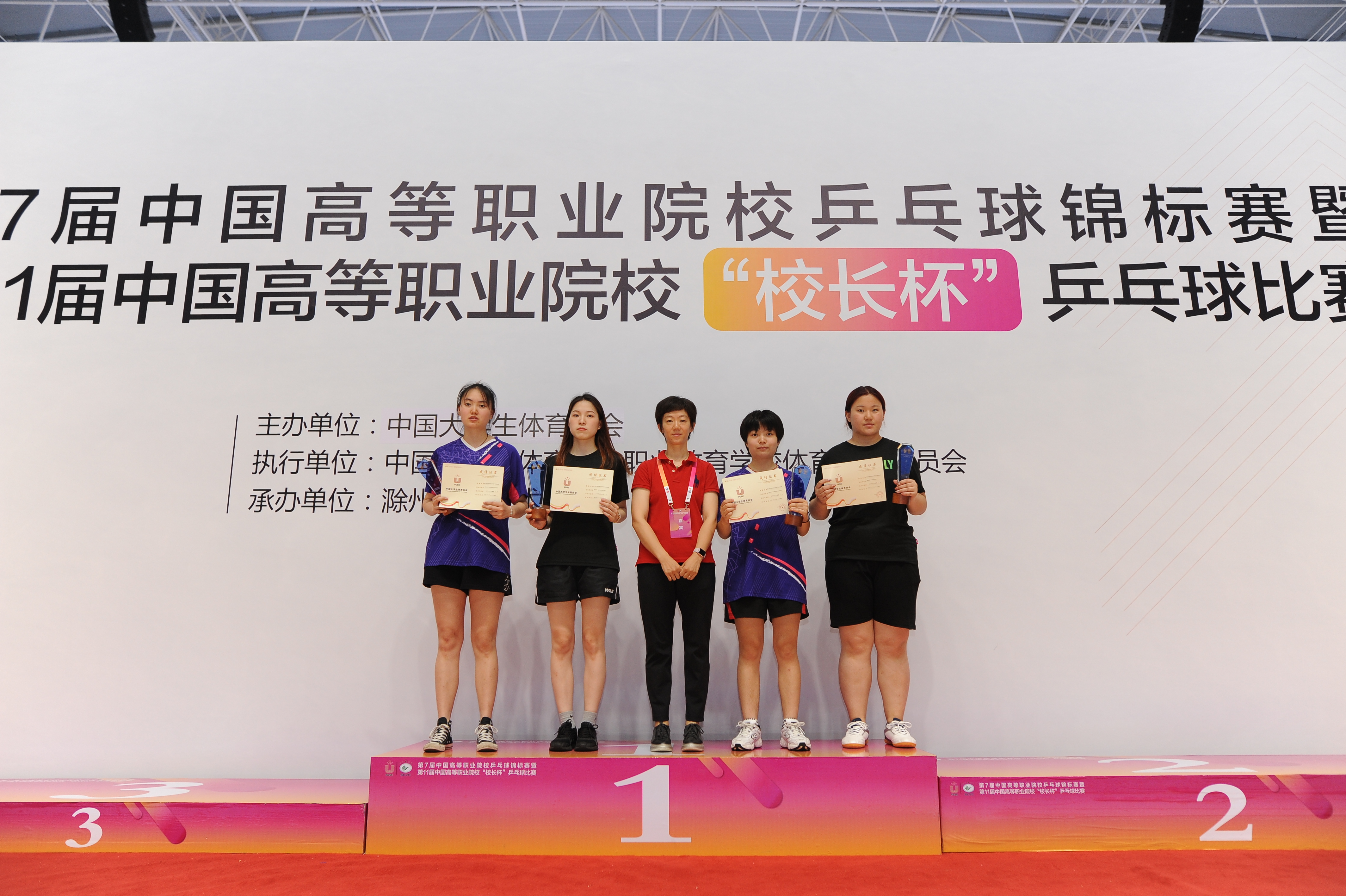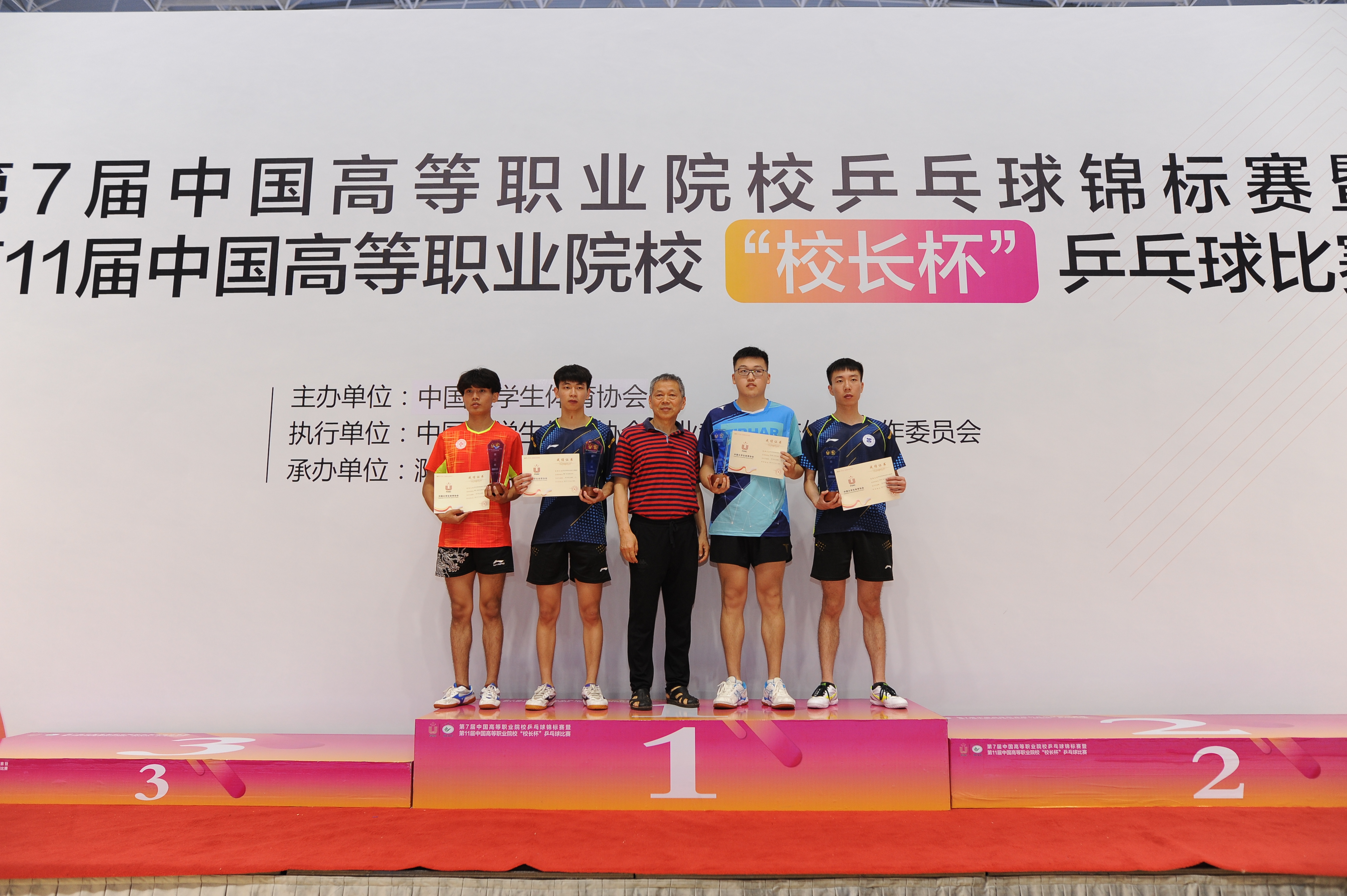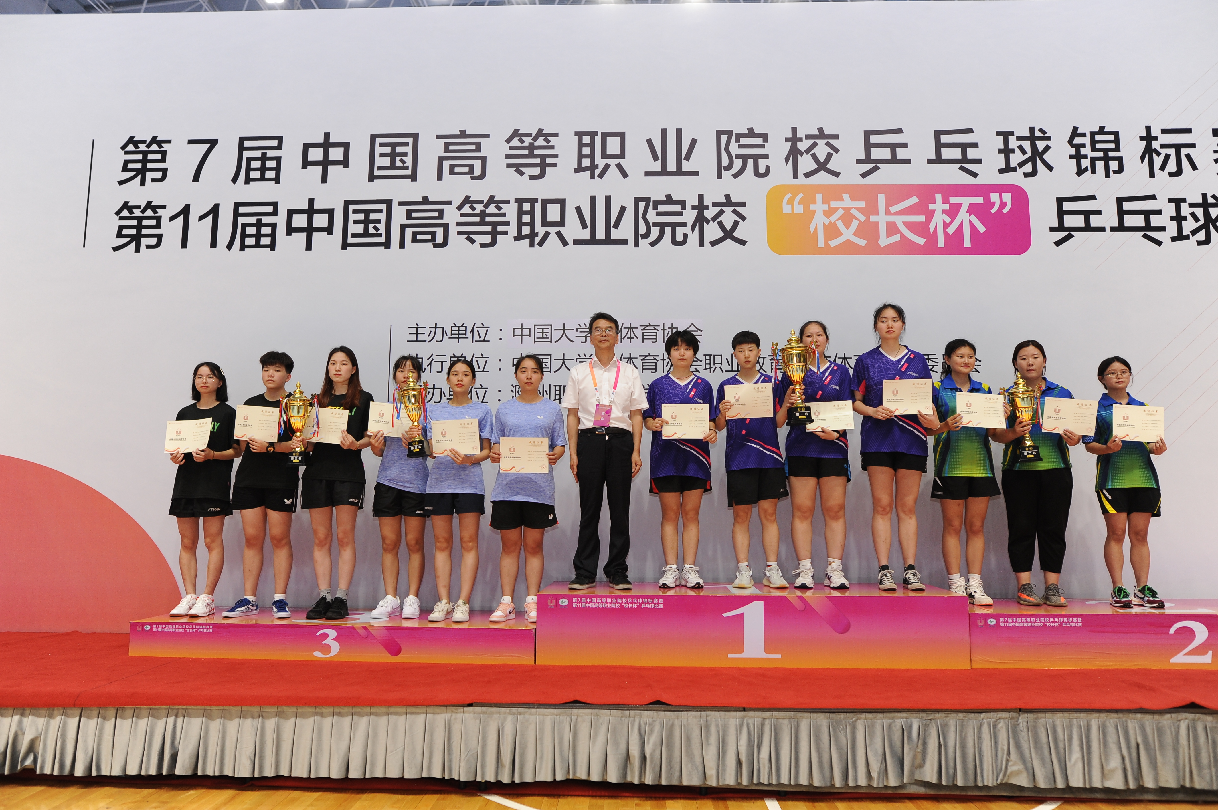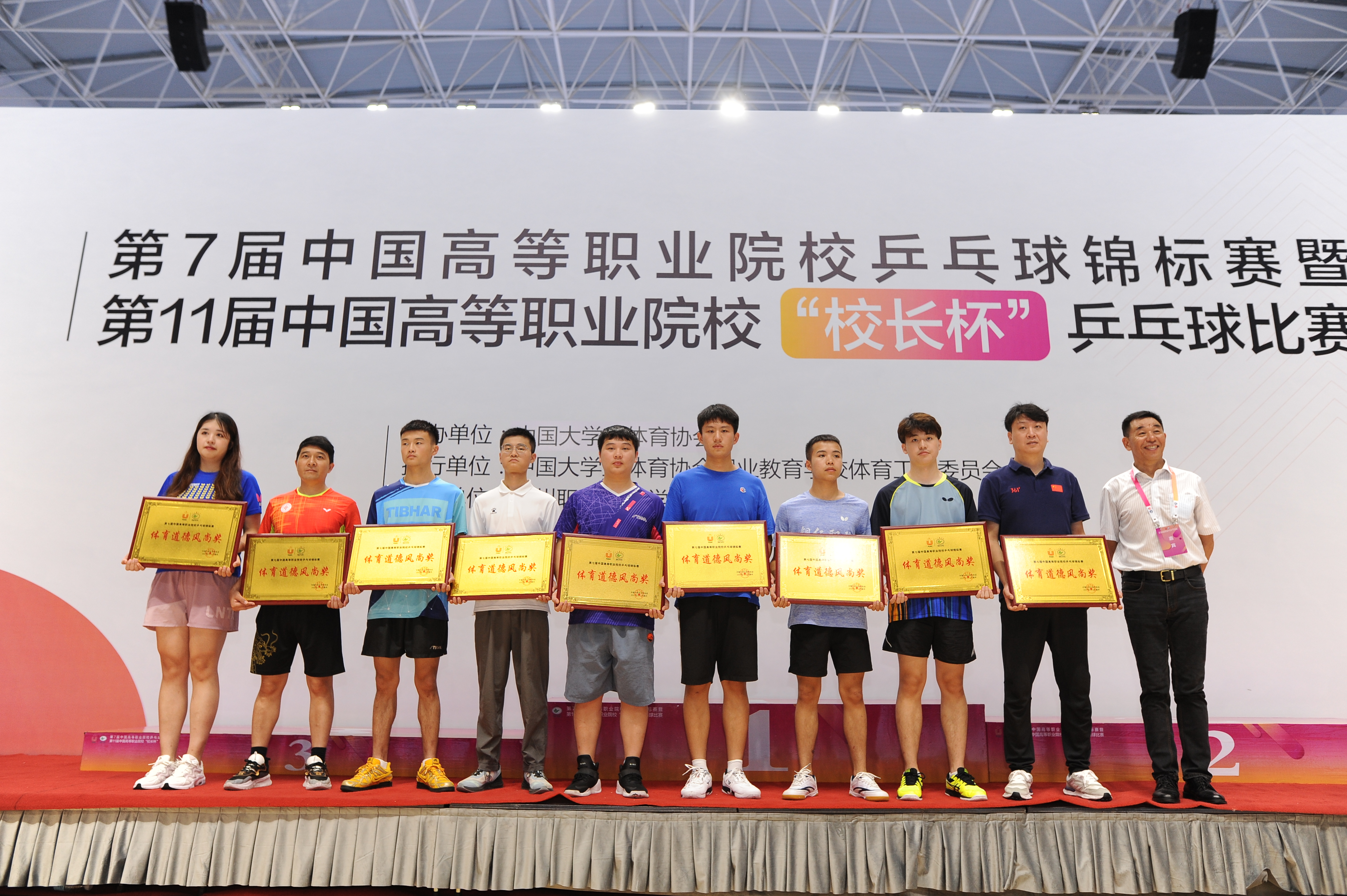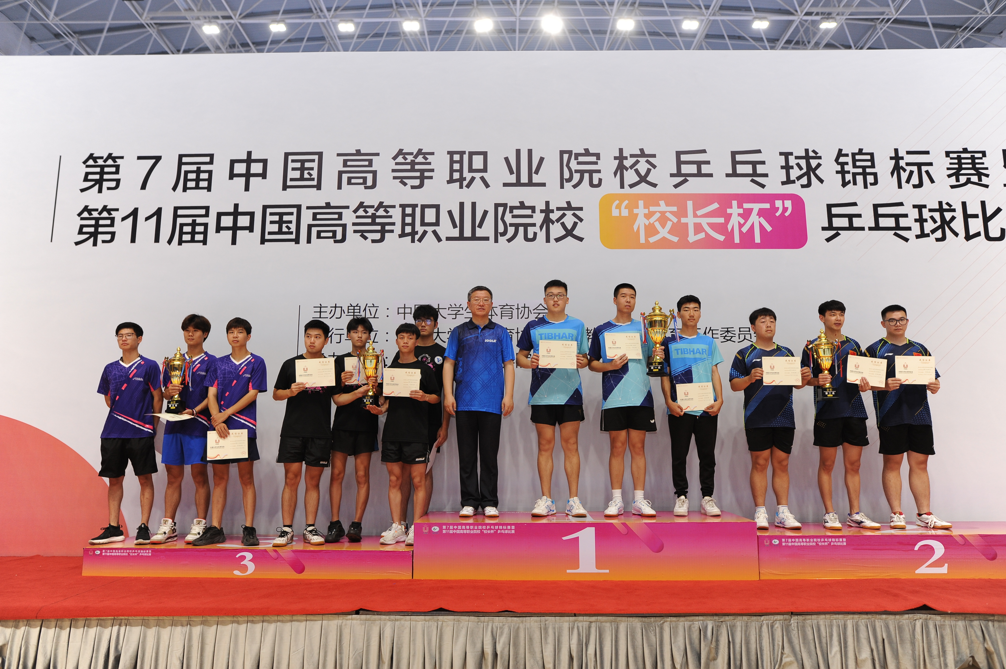 第7届高等职业院校乒乓球锦标赛颁奖仪式上,与会领导为获奖团体和个人颁奖。山东职业学院、浙江金融职业学院获得男子团体第一、二名。长沙民政职业技术学院、重庆电子工程职业学院并列男子团体第三名。长沙民政职业技术学院、渤海船舶职业学院获得女子团体第一、二名。海南政法职业学院、温州职业技术学院并列女子团体第三名。狄子豪、叶安泽分获男子单打第一、二名,谭俭、陈豪并列男子单打第三名。李泓颖、李凯悦分获女子单打第一、二名,俞佳琦、雷亦婷并列女子单打第三名。