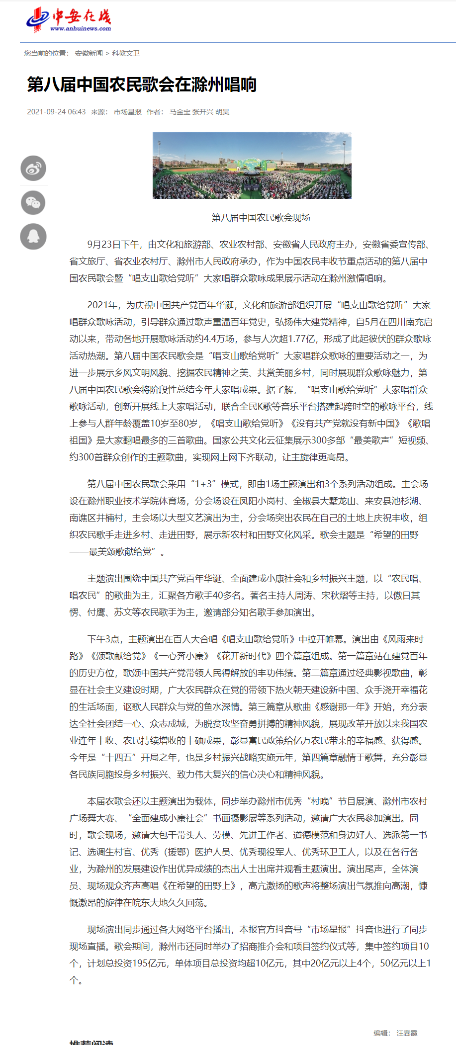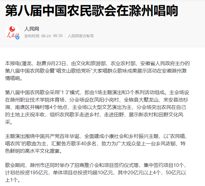 9月23日下午,由文化和旅游部、农业农村部、安徽省人民政府主办,安徽省委宣传部、省文旅厅、省农业农村厅、滁州市人民政府承办,作为中国农民丰收节重点活动的第八届中国农民歌会暨“唱支山歌给党听”大家唱群众歌咏成果展示活动在滁州激情唱响。农歌会主会场设在金沙威尼斯欢乐娱人城体育场。