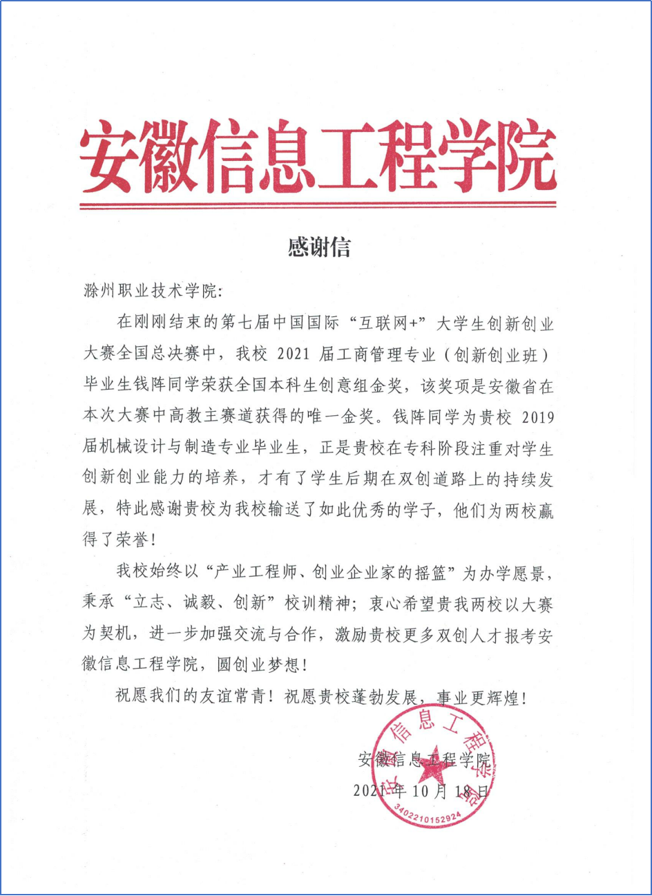日前,金沙威尼斯官网收到安徽信息工程学院感谢信,信文为,“在刚刚结束的第七届中国国际‘互联网+’大学生创新创业大赛全国总决赛中,金沙威尼斯官网2021届工商管理专业(创新创业班)毕业生钱阵同学荣获全国本科生创意组金奖,该奖项是安徽省在本次大赛中高教主赛道获得的唯一金奖。钱阵同学为贵校2019届机械设计与制造专业毕业生,正是贵校在专科阶段注重对学生创新创业能力的培养,才有了学生后期在双创道路上的持续发展,特此感谢贵校为金沙威尼斯官网输送了如此优秀的学子,他们为两校赢得了荣誉!”