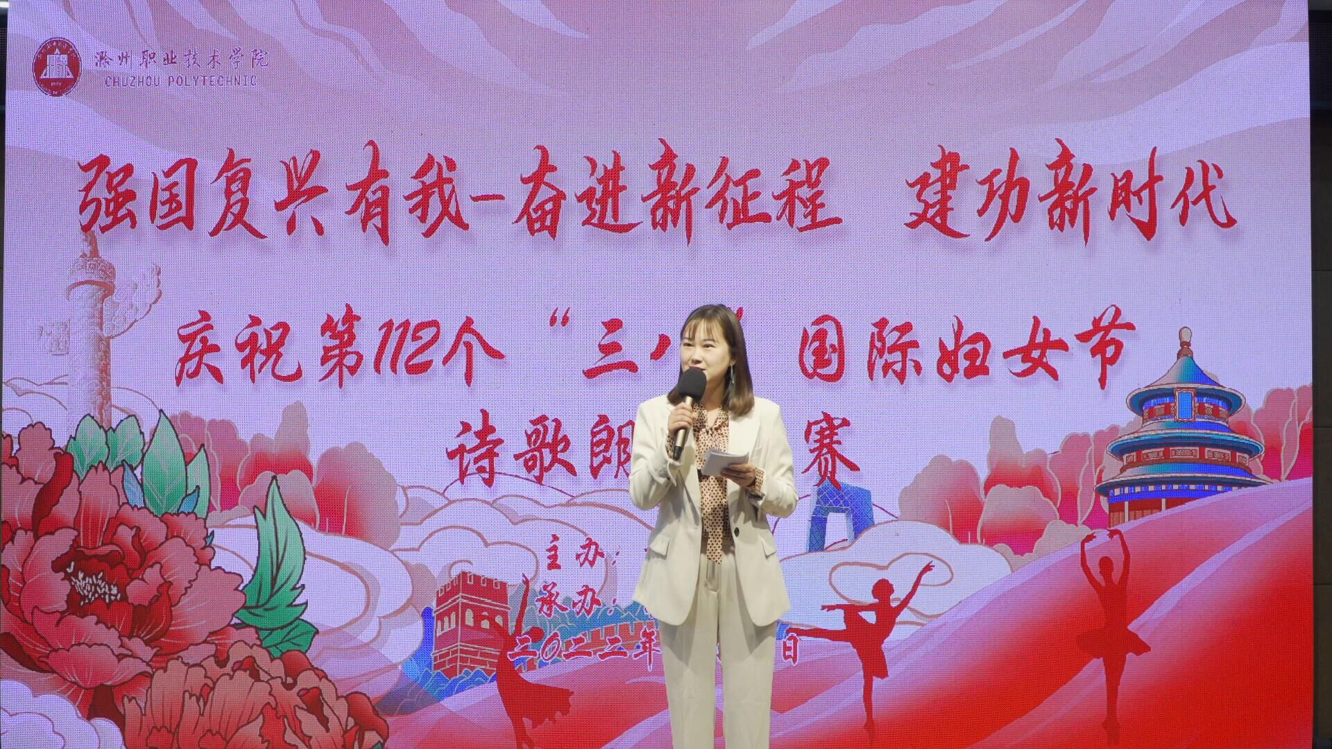 基础部分工会带来的原创作品《师之典范,时代楷模,党的优秀女儿—张桂梅》让大家热泪盈眶,管理学院院长翁嘉晨带来的《母爱》表达了对母亲的深深思念,《巾帼颂》、《木兰诗》、《最美女教师》《滁职体育梦》……朗诵会上,各个参赛队的代表们时而轻声的追述,时而深情的赞扬,时而又含蓄委婉、慷慨激昂的诵读,让整场朗诵会跌宕起伏,现场不断响起阵阵掌声。