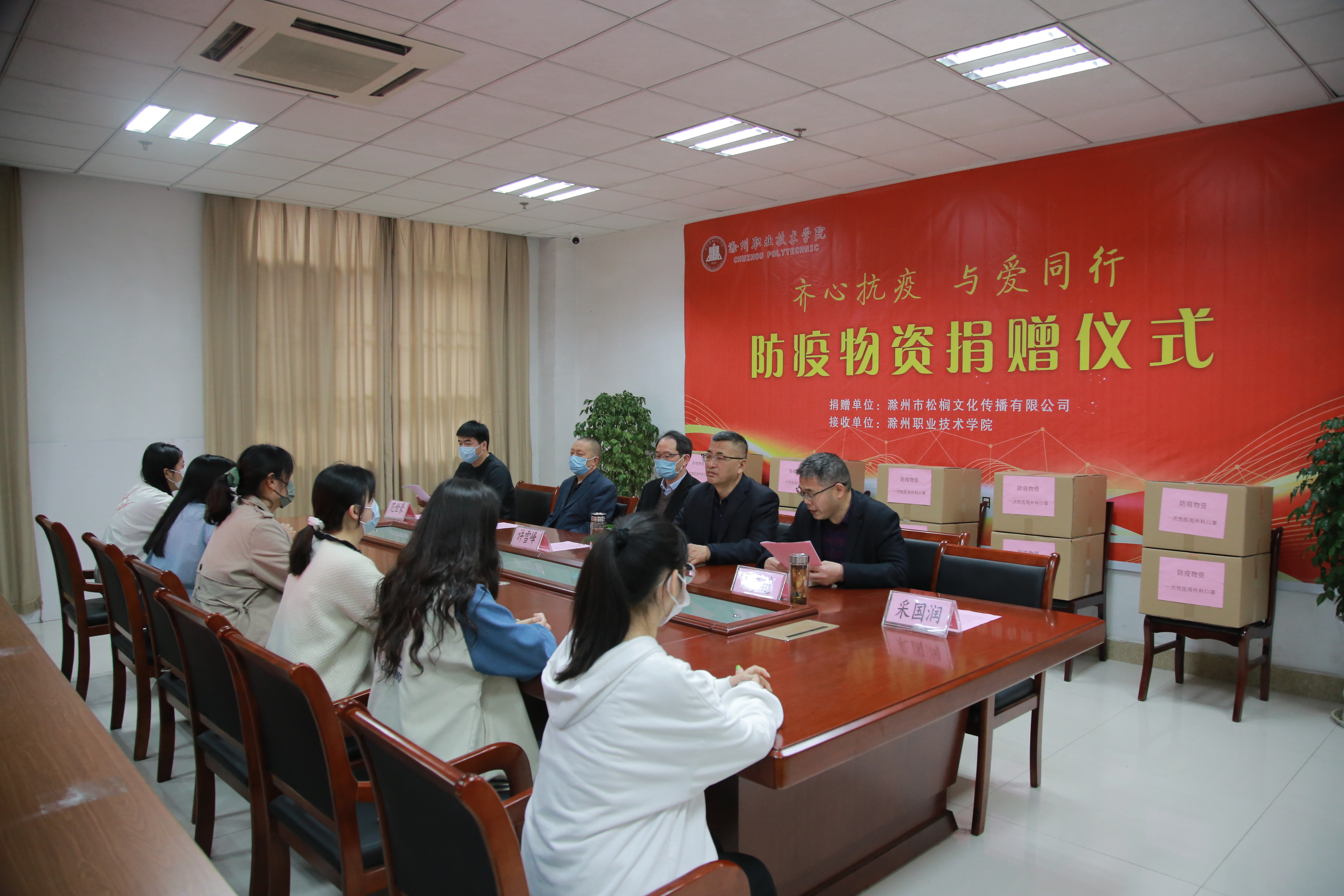 许雪峰代表学校向滁州市松榈文化传播有限公司颁发受捐证书,范世豪代表滁州市松榈文化传播有限公司向学校捐赠防疫物资。
