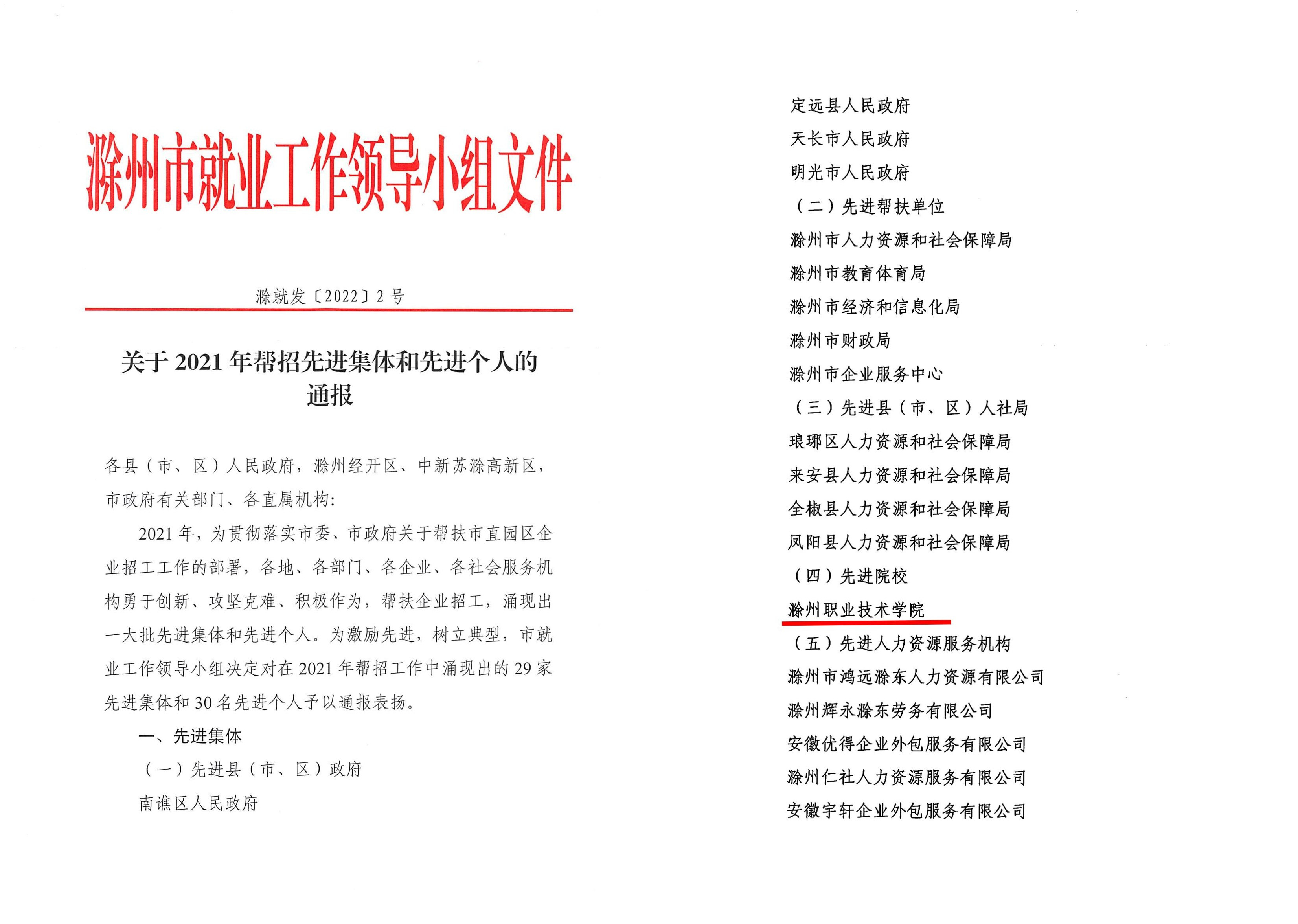 近日,滁州市就业工作领导小组《关于2021年帮招先进集体和先进个人的通报》(滁就发〔2022〕2号),金沙威尼斯官网荣获2021年帮招工作先进集体荣誉称号。