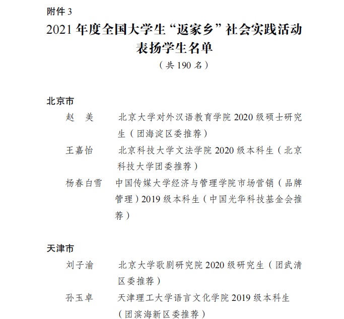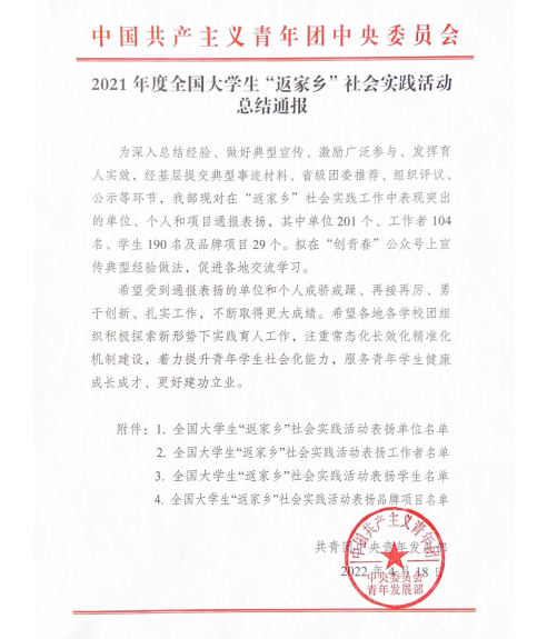 近日,共青团中央青年发展部在《2021年度全国大学生“返家乡”社会实践活动总结通报》中,对在“返家乡”社会实践工作中表现突出的单位、个人和项目通报表扬,其中单位201个、工作者104名、学生190名及品牌项目29个。金沙威尼斯官网机械与汽车工程学院王鑫同学在全国大学生“返家乡”社会实践活动表扬学生名单之列。