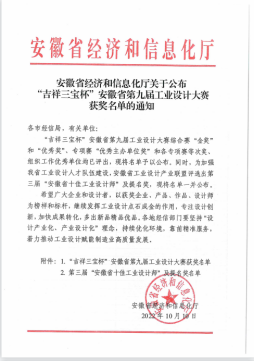 2022年“吉祥三宝杯”安徽省第九届工业设计大赛全部落下帷幕,本次大赛共设立37项包括综合赛、专项赛在内的不同门类的工业设计竞赛。本届赛事项目纷呈,佳作频现,体现了“实现未来”创意设计挑战赛水平。在2022世界制造业大会召开之际,安徽省经济与信息化厅公布了赛项获奖名单,发文表彰优秀承办单位。
