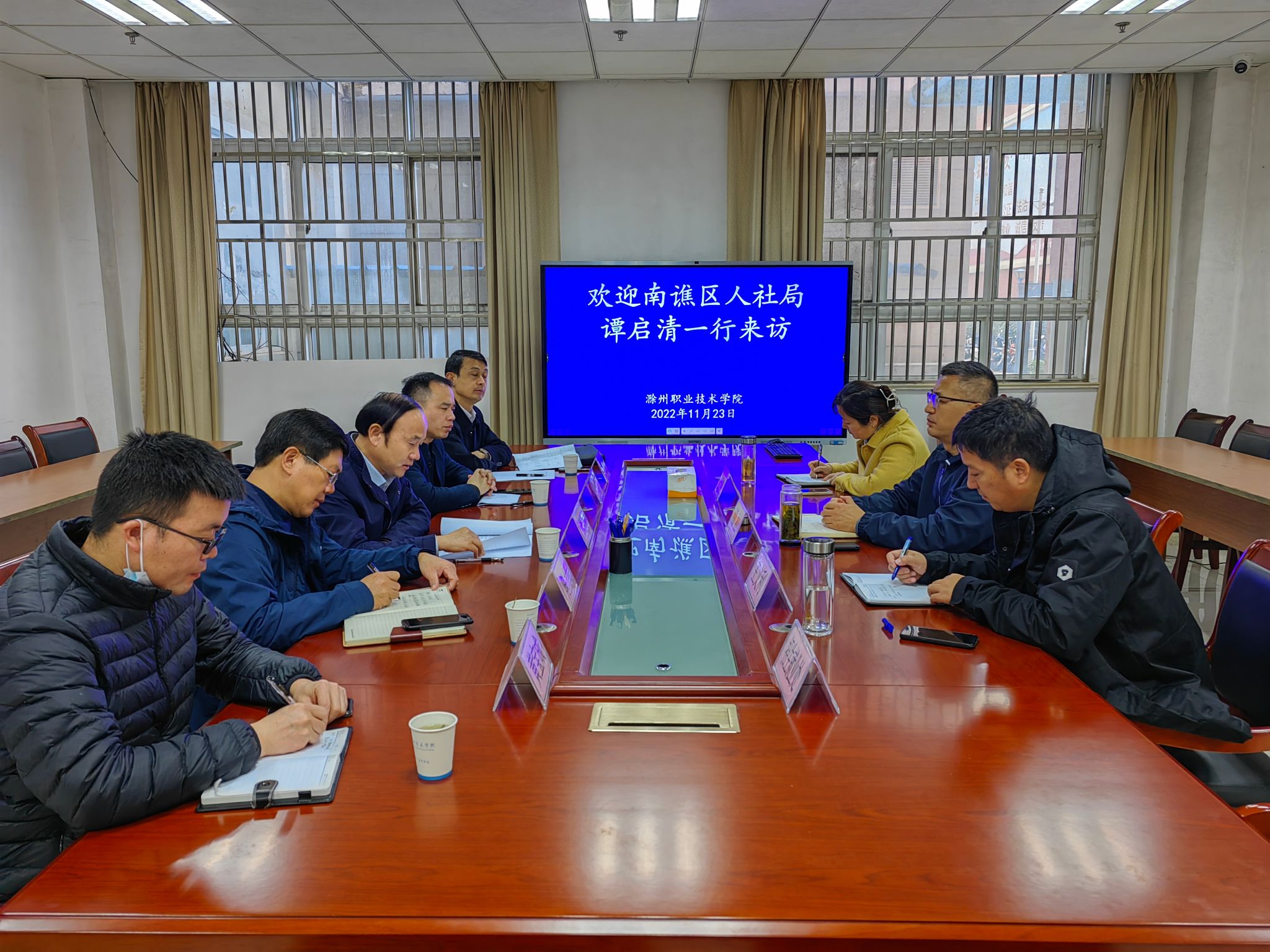 11月23日上午,南谯区人力资源和社会保障局局长谭启清带领南谯区营商环境服务中心主任付德才、南谯区教育体育局党工委副书记陈大兵、南谯区人力资源和社会保障局副局长刘立祥、南谯区公共就业和人才管理服务中心黄宝成一行来金沙威尼斯官网交流洽谈校企合作、实习就业等相关事宜。校长助理、招生就业处处长、滁州职业教育集团秘书长穆松热情接待了谭启清一行,招生就业处副处长王义利及相关人员参加了会议。