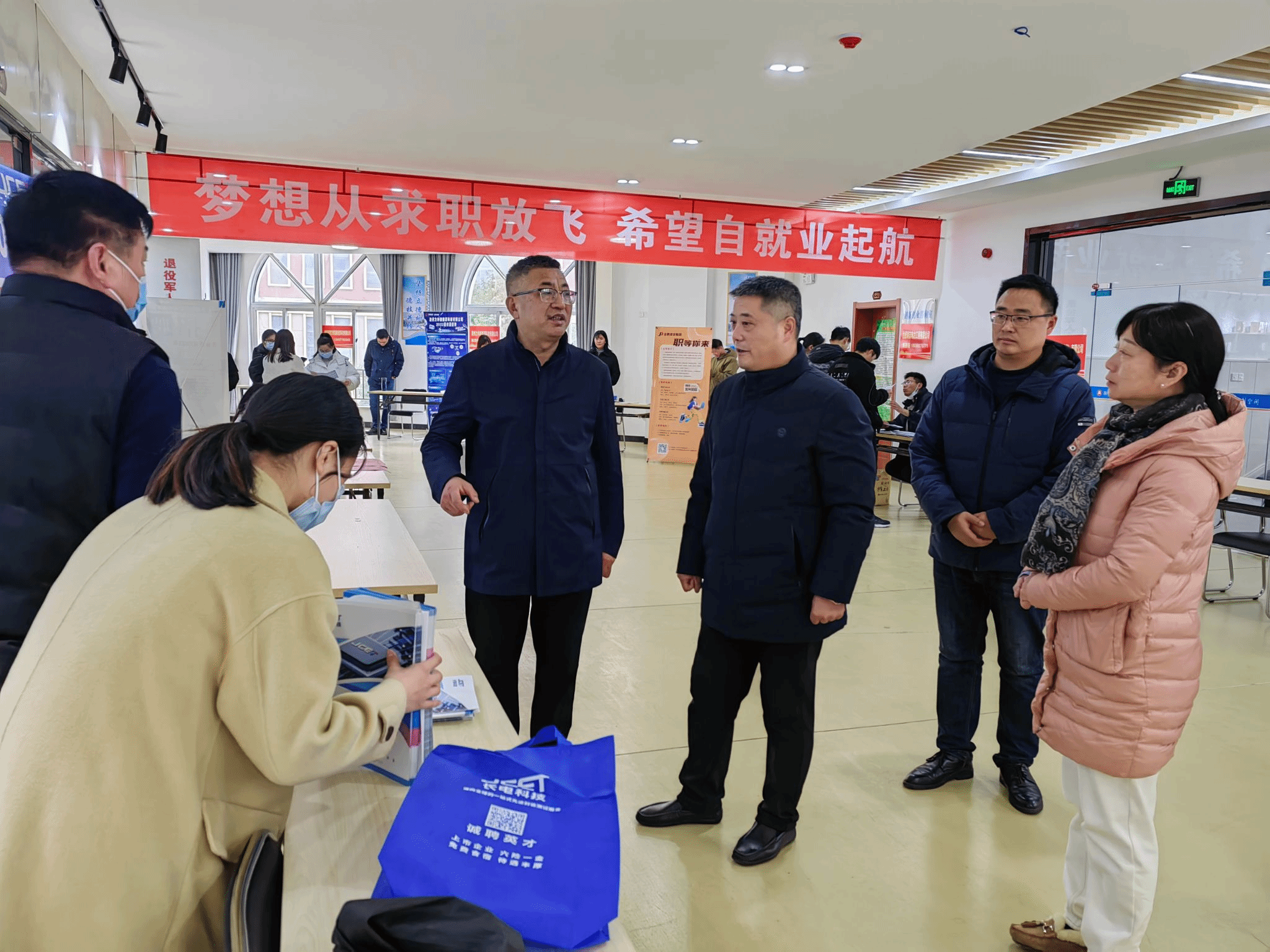 双选会现场,穆松询问了各单位的基本情况与用人需求,与参会学生交流,向同学们介绍参会企业和岗位,并对同学们在择业过程中遇到的困难与问题进行细心解导。穆松鼓励同学们,要树立正确的就业观,理性看待就业形势,准确把握政策导向,做好长远职业规划,及时调整就业目标。