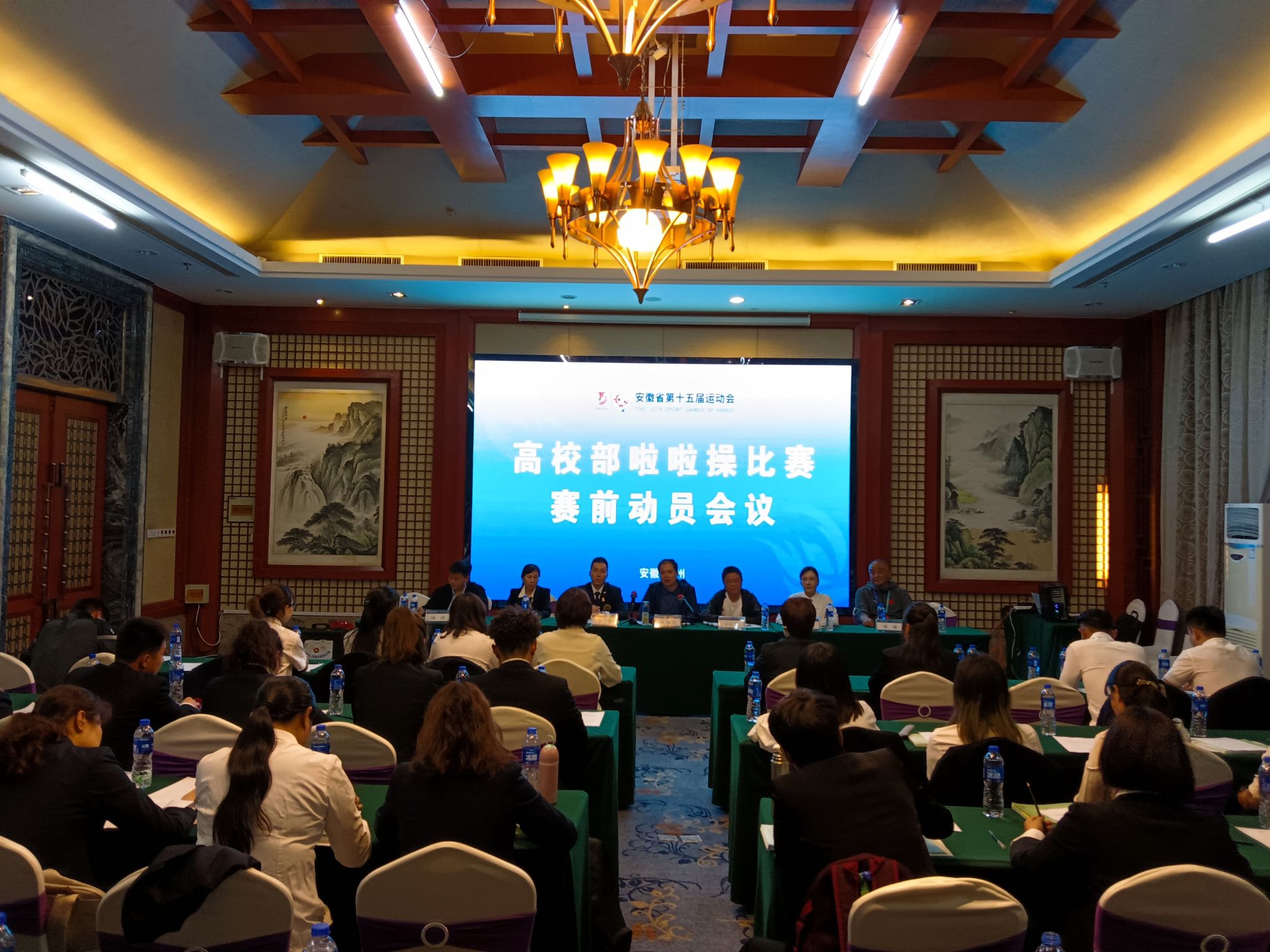 4月19日,安徽省第十五届运动会高校部啦啦操比赛在金沙威尼斯官网拉开帷幕,为了更好的履行好裁判工作,当晚,省十五运高校部啦啦操比赛裁判员培训会议在冠景酒店会议中心召开。省教育厅体卫艺处副处长葛德连、省教育厅离退休处四级调研员丁仁能、本次比赛监督万俊、本次比赛裁判长陈晓荣,本次比赛仲裁付明萍、安徽省教育厅四级主任科员陆涛、金沙威尼斯欢乐娱人城体育部主任孙强出席会议,全体技术官员、裁判员参加了会议。会议由丁仁能主持。