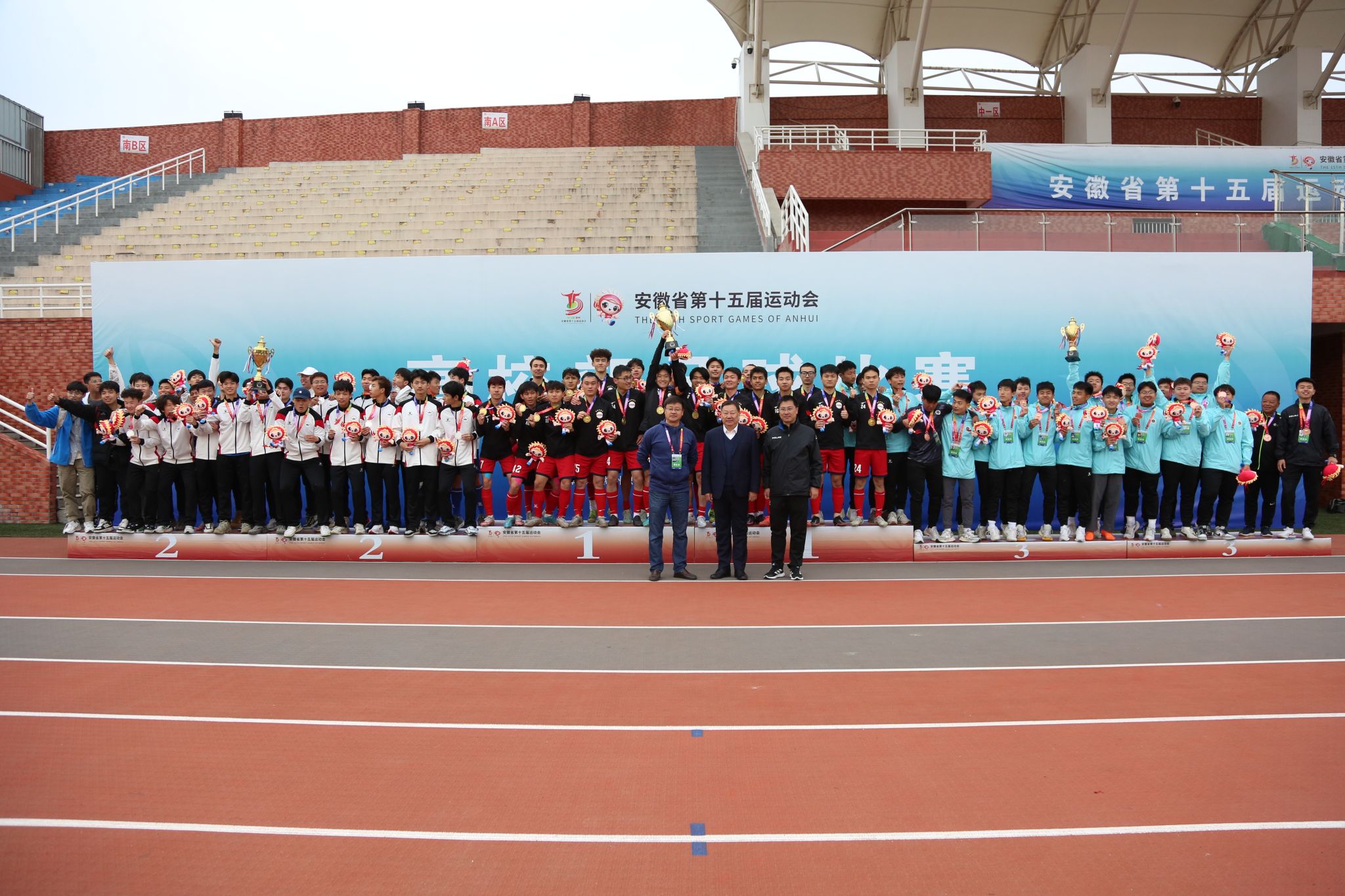 4月24日,安徽省第十五届运动会高校部足球比赛第二阶段颁奖仪式在金沙威尼斯官网顺利举行。来自全省各地的22所高校、34支代表队、745名领队、教练员、运动员参加了该阶段的比赛。
