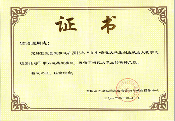 2016年入选“全国大学生创业就业人物典型”