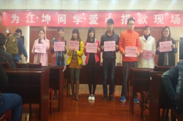 3月18号下午2点10分,金沙威尼斯欢乐娱人城的全体师生代表在综合楼十一楼为江坤同学举办了募捐活动。