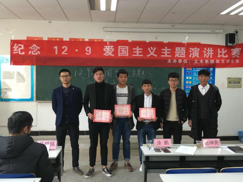 爱国主义教育是提高全民族整体素质的基础性工程,是引导人们特别是广大青少年树立正确理想、信念、人生观、价值观,是促进中华民族振兴的一项重要工作。为培育未成年人心向党、跟党走的高尚情感和远大志向。土木工程系于12月9日在土木楼4119阶梯教室组织了以“129爱国运动”为主题的演讲活动。大赛邀请了团总支书副书记赵绅尧,学生会主席涂鹏、副主席张康康、马驰骋、马哲明以及秘书处部长刘肇琨担任本次大赛的评委。