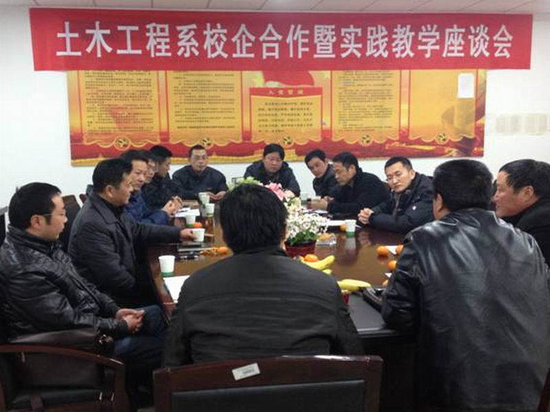 根据本系的实践教学工作安排,我系于2012年12月20日下午召开校企合作企合作暨实践教学座谈会,本次邀请了浙江联谊公司的邓总、江苏龙海建工集团的郑总、中城建第六工程局集团的欧阳经理、金鹏建设集团的杨总和李总、六安市建工建设监理有限公司的杨其龙总监、滁州市会峰建安公司的总工王栋等,同时邀请学院教务处周多道副处长等2人,参与此次座谈会的本系人员有朱永祥主任、刘文元书记、陈兴友副书记、张国富副主任及相关教研室主任及部分骨干老师。