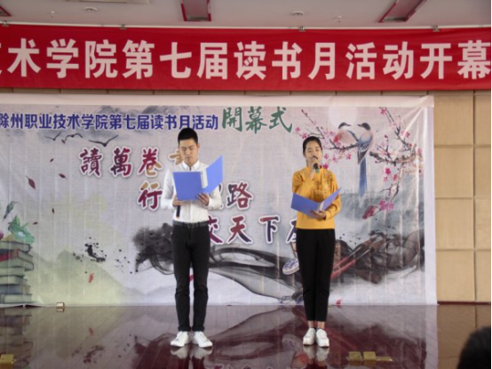 开幕式上,盛丽蓉馆长进行致辞,她热情洋溢的讲话感染了在座的同学们,号召同学们应该培养喜爱读书的优秀习惯,从书中汲取丰富的知识,最后在同学们的热情掌声中苏和堂馆长宣布第七届读书月活动正式开幕。开幕式后,我们欣赏了精彩的表演。古筝表演《茉莉花》,悦耳动听;舞蹈表演《半壶纱》,韵味十足;古诗朗诵《春江花月夜》,生动传神,引的观众掌声不断。