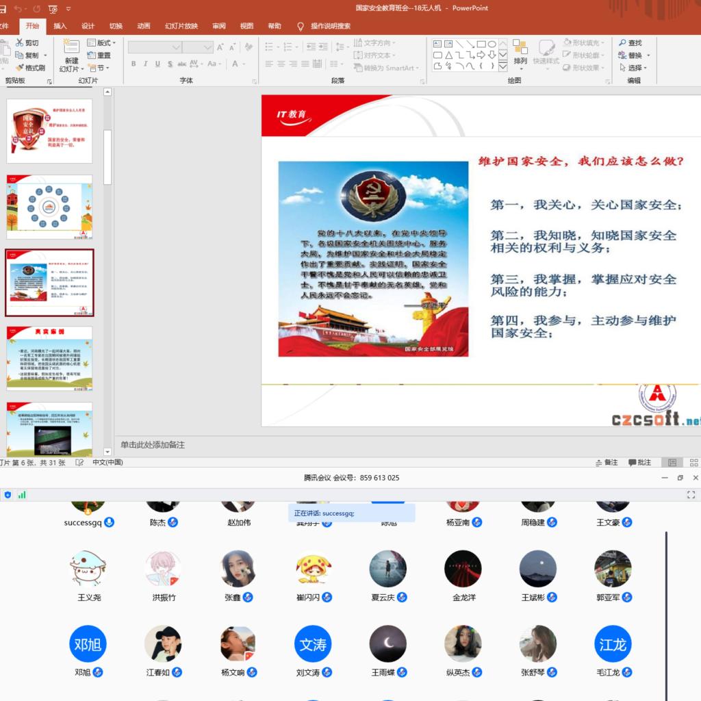 继我院各班辅导员组织学生错峰观看完“千万学生同上一堂国家安全教育课”,为了进一步教育引导广大学生牢固树立国家安全意识,自觉维护国家安全,我院各班级依托QQ群、腾讯会议等网络平台,陆续开展了“国家安全教育”线上特别主题班会活动。