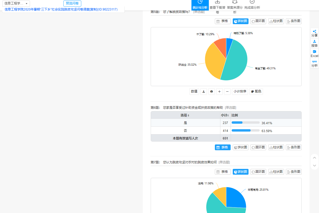 同时,为调查我国脱贫攻坚的情况,我院设计了线上的问卷调查,内容围绕贫困原因、贫困政策、脱贫工作的问题、政府采取的脱贫措施等。同学们积极响应并转发,认真作答,最终共收集到问卷调查样本651份。通过调查结果了解到我国的脱贫工作已取得了显著效果,脱贫政策已基本普及,人民生活水平也得到明显改善。