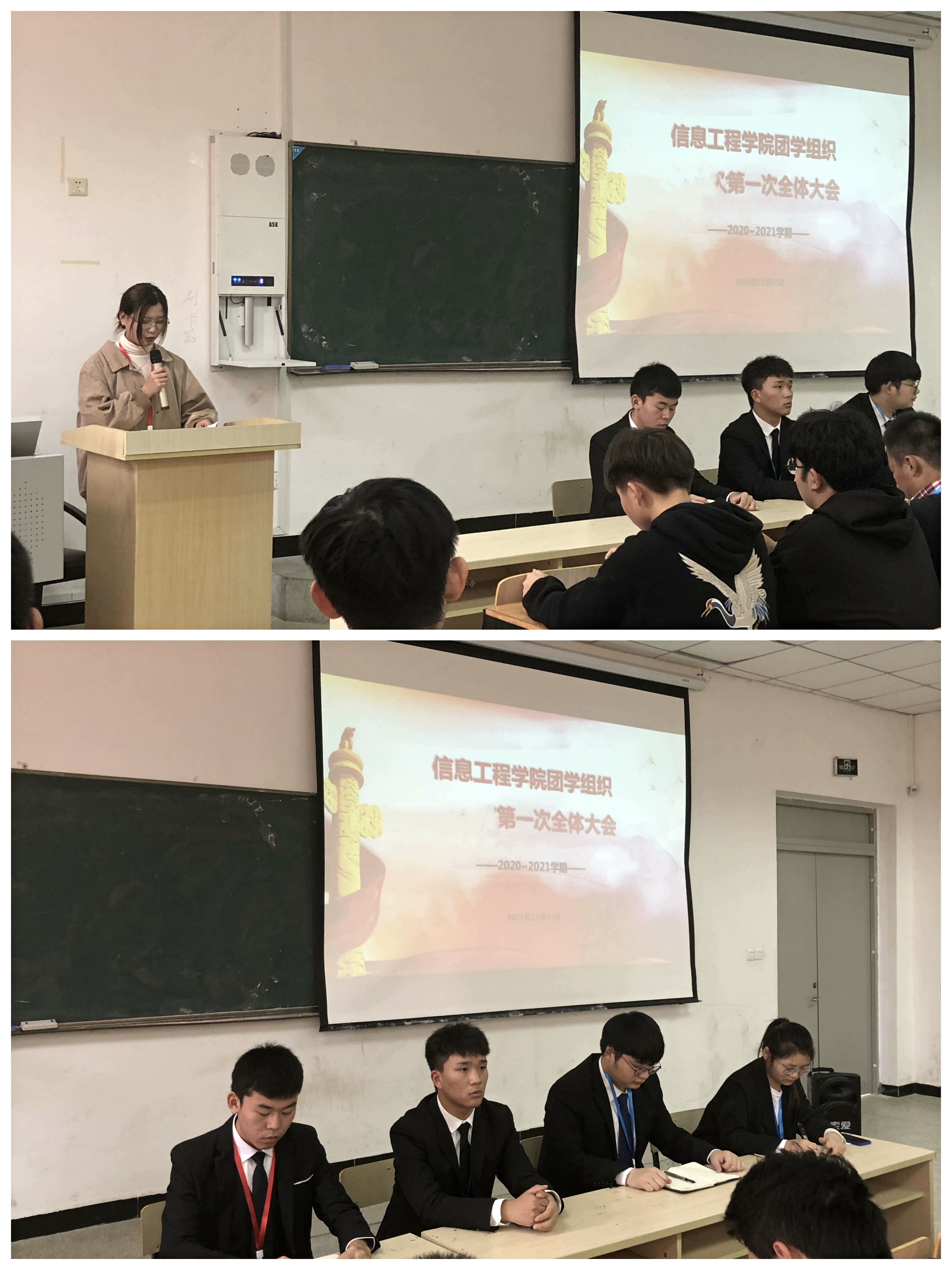 为保证我院本学期团学组织各项工作的稳步推进。11月17日,信息工程学院团学组织在南阶103召开了2021-2022学年第一学期全体大会。信息工程学院团总支副书记、学生会主席团以及团学组织的全体成员出席本次大会。