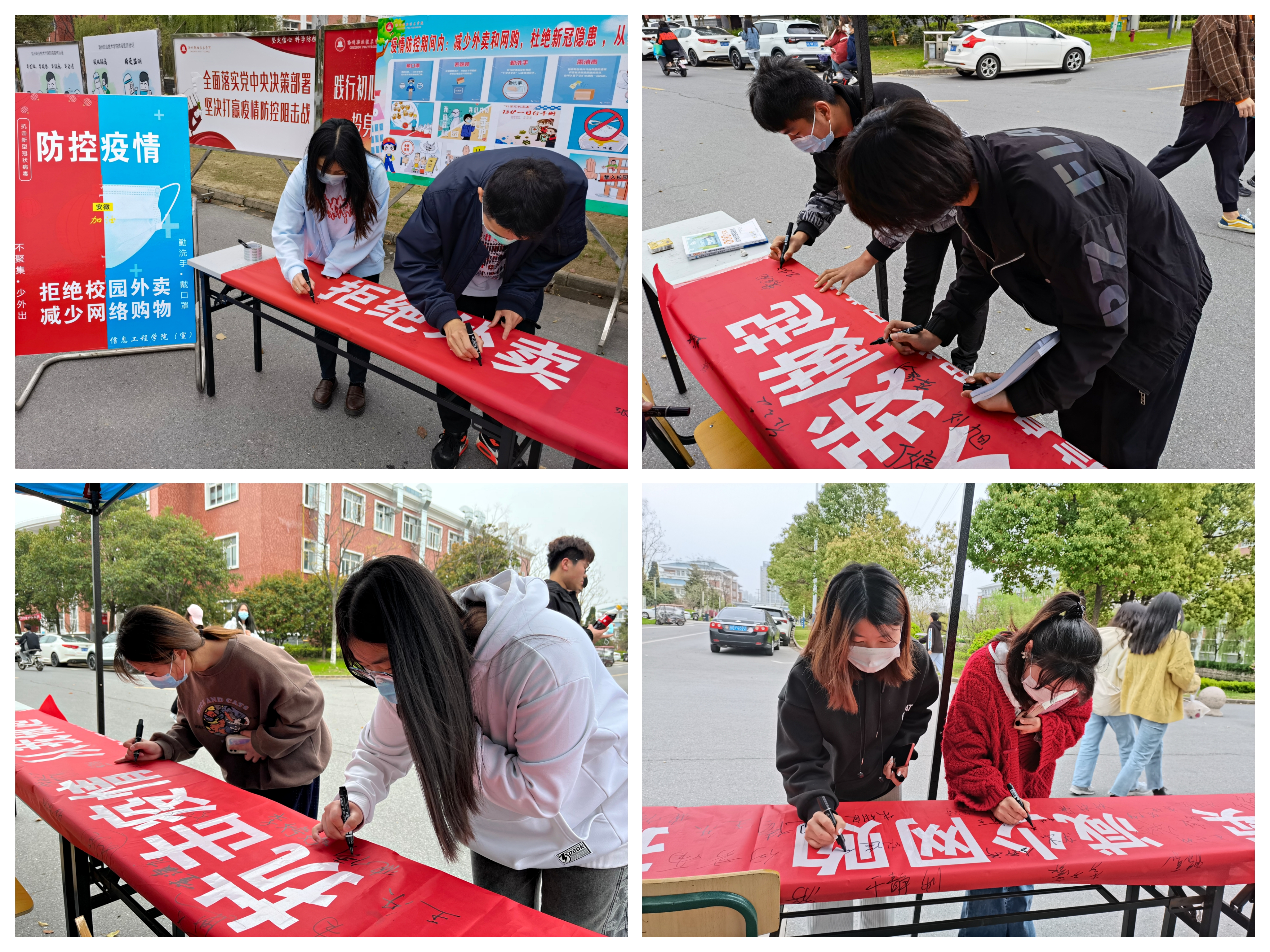 活动中,团学干部组织我院各班级学生代表在教室中进行签名,同时利用下课时间在食堂和超市周边组织来往同学进行签名。签名过程中,我院团学干积极向同学们宣传外卖和网购的风险,呼吁同学们为了自身健康和平安校园,要拒绝外卖,尽量在校内食堂或自带餐具打包回宿舍就餐,错峰用餐。且疫情期间,学校物资保障充足,请同学们理性消费,非必要不网购,减少快递流动,降低感染风险,在学校超市购买生活必需品。同学们主动在横幅上签上自己的名字,并纷纷表示争做拒绝外卖、非必要不网购的行动表率,以实际行动带动身边更多的同学。