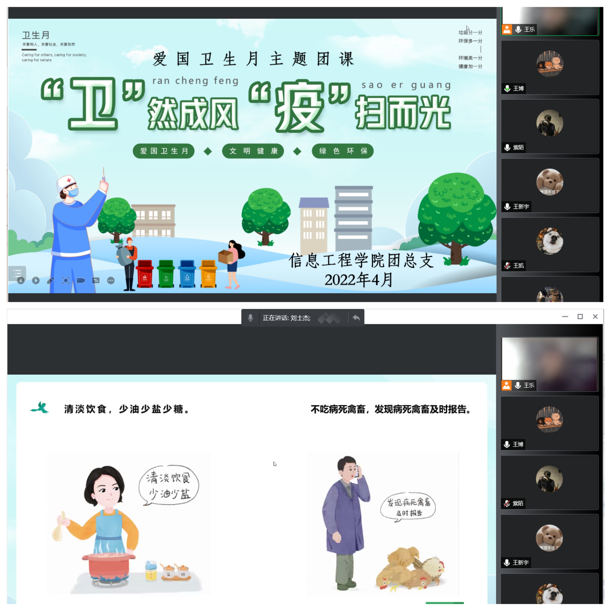 今年4月是第34个爱国卫生月,为引导我院学生践行文明健康绿色环保生活方式,筑牢疫情常态化防控大防线,4月25日,信息工程学院各班级团支部开展了以“文明健康 绿色环保”为主题的爱国卫生月主题团课。