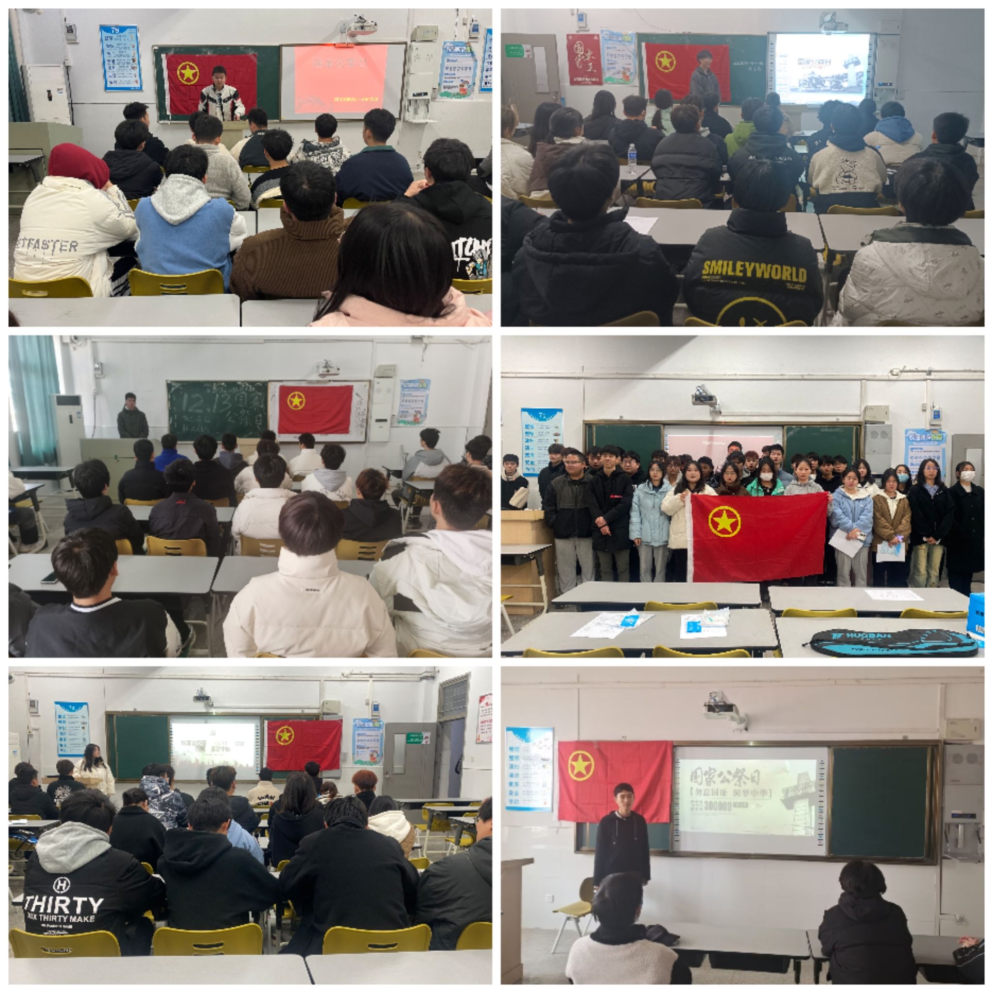 活动伊始,各班团支书宣读悼念活动公祭词,同学们起立默哀一分钟,缅怀30多万遇难同胞。活动中,各团支部紧紧围绕团日主题,向同学们介绍了国家公祭日的由来及意义,通过播放有关抗日战争的视频,制作PPT图文宣讲,再现日本侵略者战争罪行来教导同学们要勿忘国耻,牢记使命,把爱国主义信仰永固于灵魂深处。