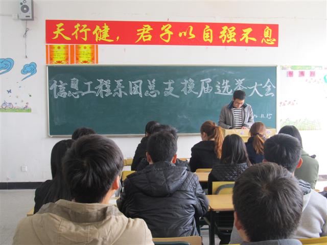 2012年11月15日中午,信息工程系团总支换届选举大会在2503教室顺利举行,参与换届选举大会的有我系团总支书记杨阳老师和全体团干,团总支副书记张晓超主持大会,同时,我系学生会主席团也莅临观摩。