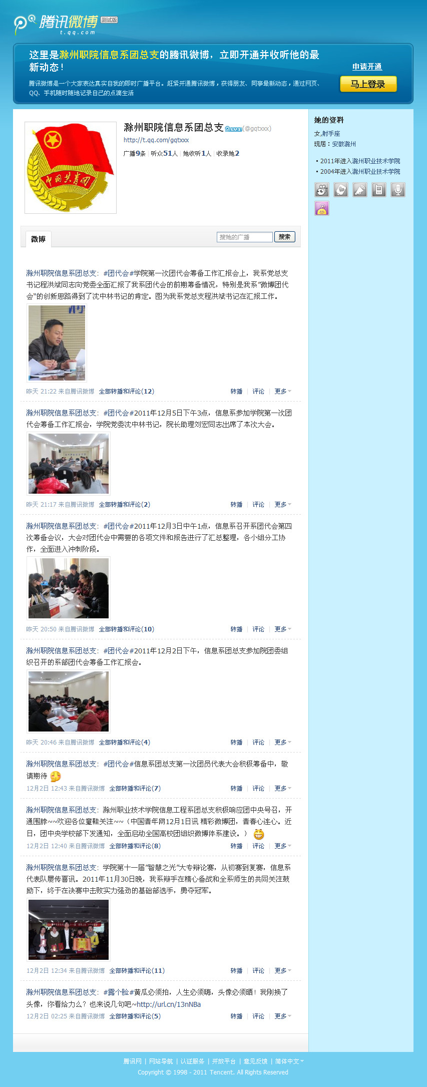 2011年12月2日,信息系工程系团总支积极响应团中央全面启动全国高校团组织微博体系建设的号召,进驻腾讯微博,开展团代会网络宣传工作。这种时尚新颖、开放互动的宣传模式凸显了青年的主体地位,符合青年的成长特点,受到了我系团员青年的热议和好评。(信息系团总支微博地址:http://t.qq.com/gqtxxx )