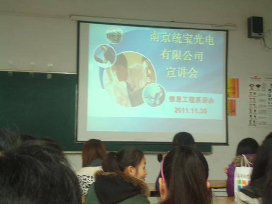 2011年11月30日,信息工程系在2502多媒体教室举办统宝光电(南京)有限公司专场招聘会,09级约50名专业对口学生参加了本次招聘。