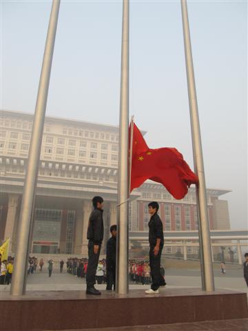 7点25分,在10计维1班赵家路同学的主持下,升旗仪式准时开始。我系国旗班的旗手们踏着矫健的步伐,以饱满的热情,庄严地护卫五星红旗进场。随后,雄壮有力的《义勇军进行曲》响彻了整个校园,老师和同学们集体行注目礼,全场弥漫着一种庄严肃穆的气息。鲜艳的五星红旗冉冉升起,点燃了大家不断向上的斗志,激发了同学们强烈的爱国热情。