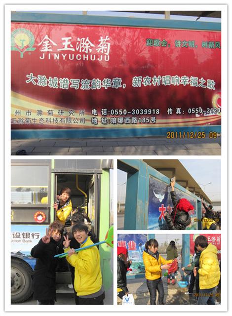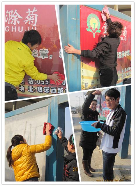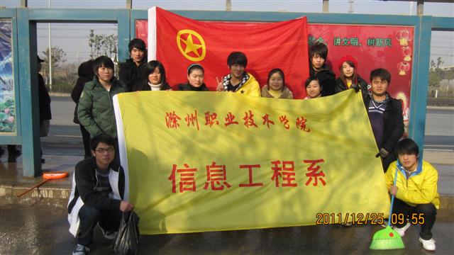 2011年12月25日上午,信息系团总支积极响应院团委号召,组织十余名志愿者进行市容美化清洁服务。志愿者们积极分工合作,对4路线腰铺天桥上下行公交站牌及周边角落进行了清洁清理。通过志愿者们的辛勤劳动,公交站牌极其周边焕然一新,得到了周边居民的赞扬。