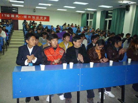 李云松老师致词后,到场师生共同观看了精心制作的开幕式宣传视频,第一季的计算机硬件知识讲座活动就拉开了帷幕。图文并茂的幻灯,生动有趣的演讲方式,IT行业最新的硬件知识,李云松老师的博学深深地吸引了在座的每一位同学,会场不时爆发出阵阵热烈的掌声。