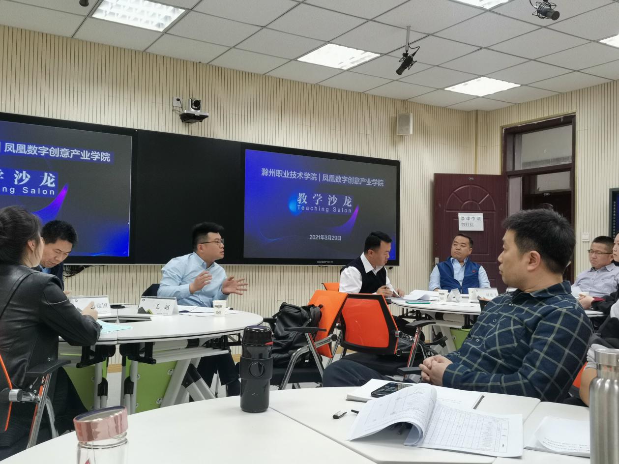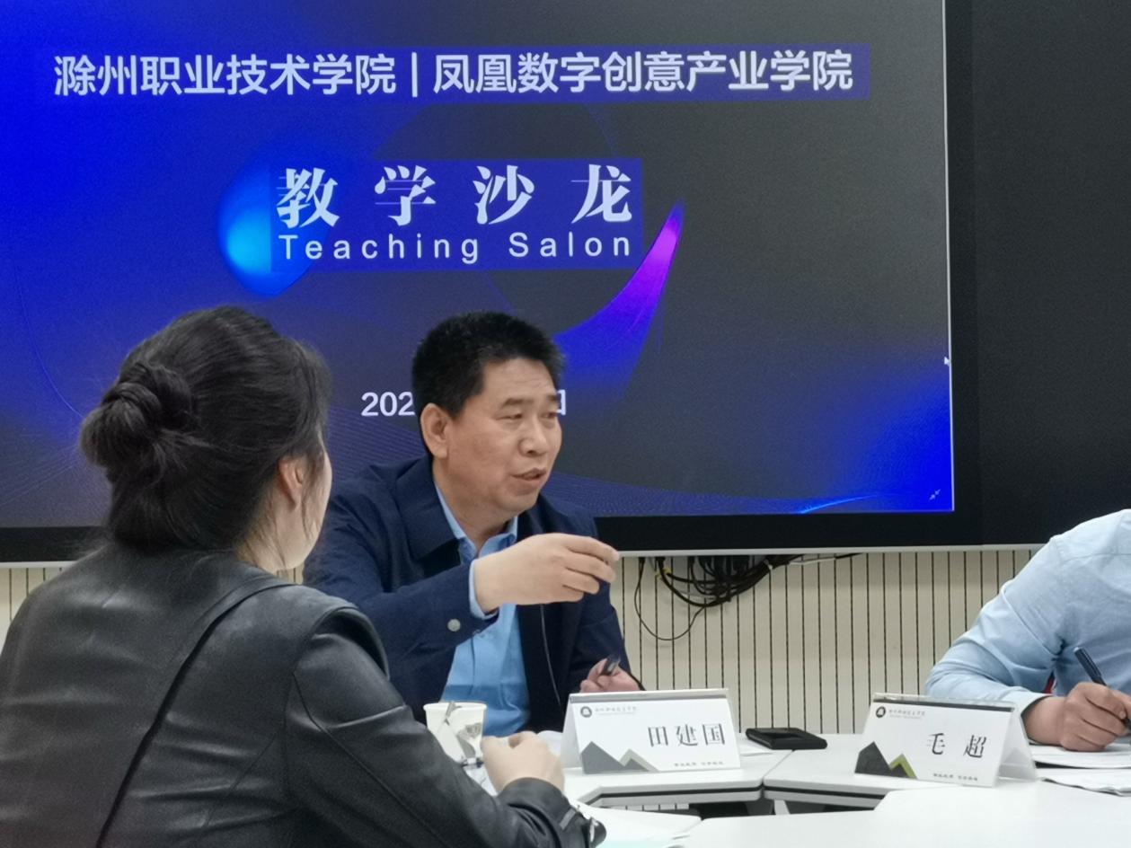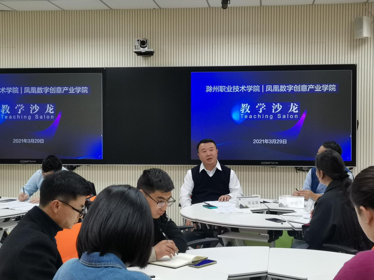 3月29日下午,金沙威尼斯欢乐娱人城凤凰数字创意产业学院在传媒与设计学院举办教学沙龙,凤凰数媒产教集团副总裁(研发)毛超,凤凰数媒产教集团总裁助理刘建飞,教育部全国广播影视职业教育指导委员会主任委员、保定职业技术学院教务处处长田建国,新闻传播教育指导委员会主任委员许志强等出席,传媒与设计学院党政领导干部及数字媒体系全体老师参加本次活动。传媒与设计学院副院长杨之武主持教学沙龙。