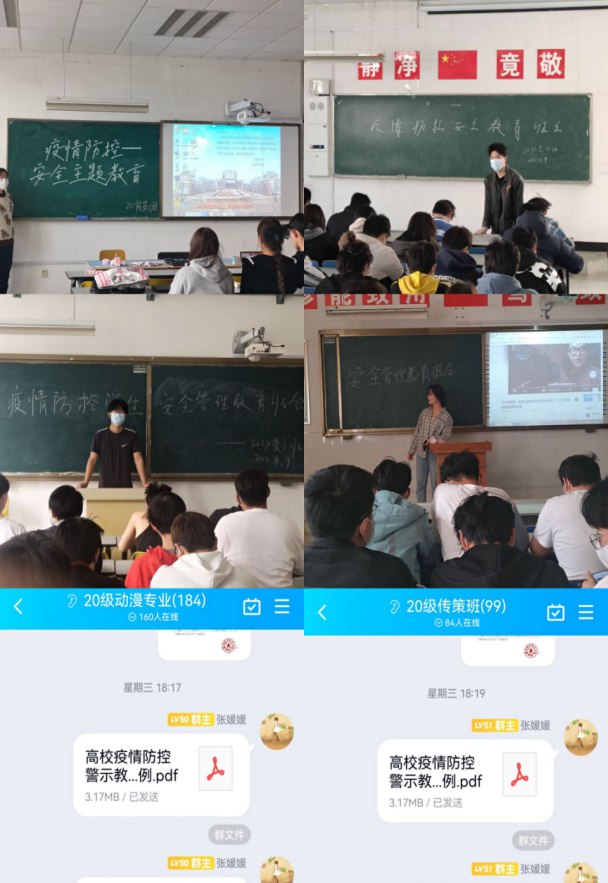 疫情就是命令,防控就是责任。近日,传媒与设计学院进一步落实强化学生教育管理有关工作,各班级辅导员利用在校学生下课期间、微信群、QQ群、腾讯会议等线上线下结合方式,开展疫情防控警示教育主题班会。