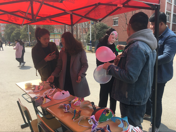 为了比赛的顺利进行,工作人员早早到达现场,有条不紊地布置展台与宣传活动。展出正式开始后,各种形形色色、别具匠心的面具引得过路的同学们驻足观看、不停称赞。面具风格迥异,高贵典雅、可爱温馨、惊悚狰狞的图案设计让人赞不绝口,不管是复杂的花纹还是简约的线条,都凝聚了同学们的奇思妙想,表现出同学们的动手操作能力。工作人员热情地进行宣传,同学们被别有新意的面具吸引,纷纷在展台前驻足,欣赏各具特色的面具作品,有的同学对面具非常的喜欢,我们也就把面具送给了他们,把传媒学子的风采展现在同学们的面前。