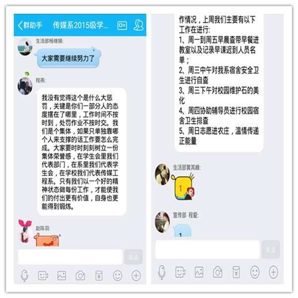 首先,各干事在QQ群中签到,接下来由主席程燕总结了上一周工作情况。然后,对一些表现不错的干事进行了表扬;对于平时旷班的干事进行了批评并給予相应的处罚措施。最后,主席强调了本周工作的重点,也再次鼓励学生会干事在接下来的工中作再接再厉。