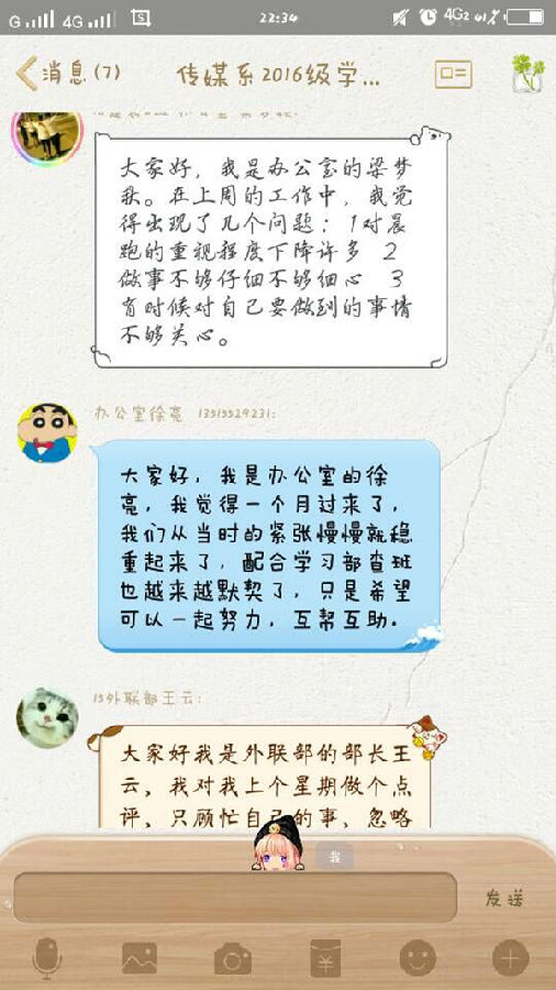 2016年11月14日晚上九点传媒系学生会利用通讯平台网络召开了由学生会主席组织主持的传媒系学生会第一次网络会议。