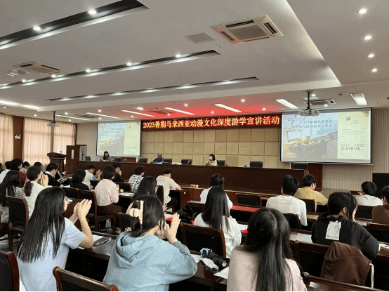 活动邀请了合肥皖华出国留学机构的相关负责人和教务老师,刘老师对马来西亚的地理气候、名胜古迹、风土人情进行了简单的介绍,特别对马来西亚斯特雅大学的的办学历史、世界排名、校园环境、住宿条件、教学设施、游学费用等进行了图文并茂的详细讲解,同时展示了金沙威尼斯官网往届毕业生制作的在马来西亚游学体验的PPT,让同学们更加直观的感受到国外游学氛围。