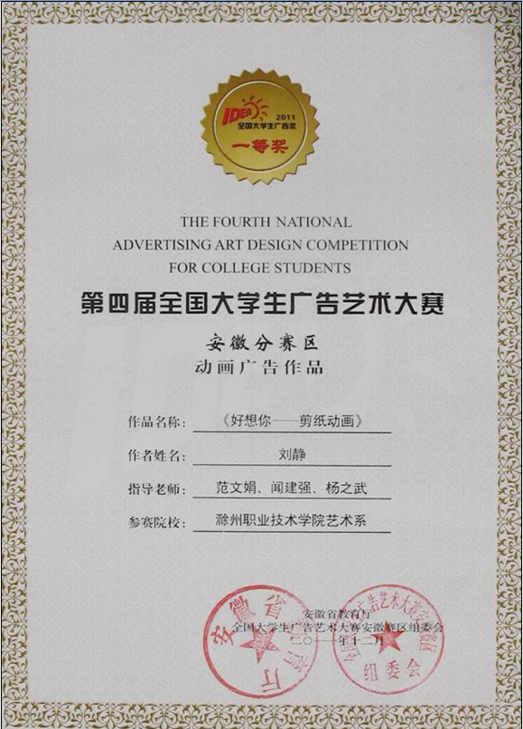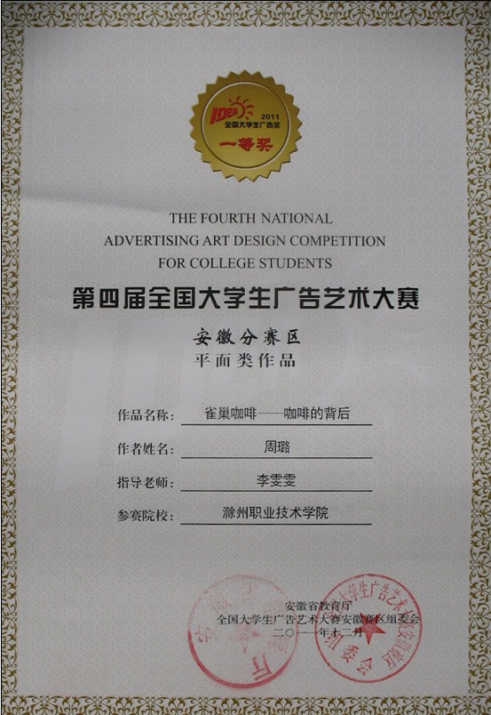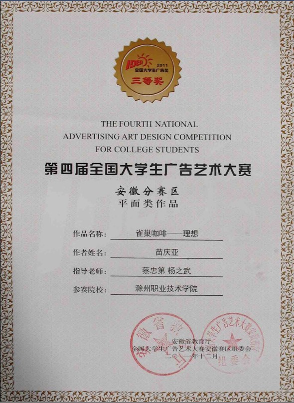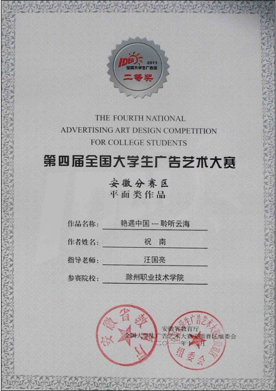 近日“全国大学生广告艺术大赛(安徽赛区)”获奖证书由省教育厅正式发放,我院艺术设计系学生获奖作品如下: