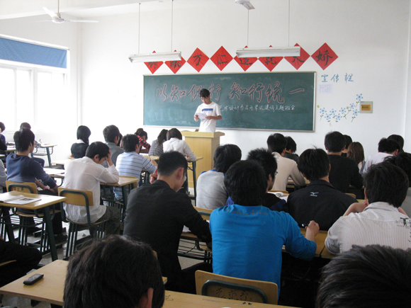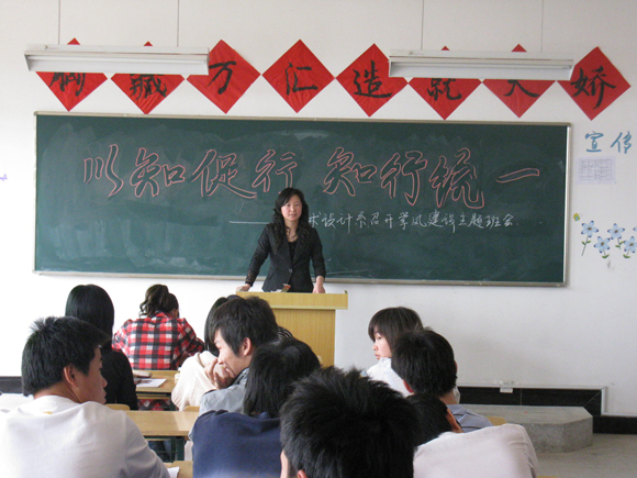 为切实贯彻学院学风建设实施方案,推动我系学风建设良性发展,提高学生遵章守纪的自觉性,激发学习热情,2011年4月26日,艺术设计系09级建筑装饰工程技术专业班同学在孙桂琼老师的指导下,召开了“以知促行,知行统一”学风建设主题班会。