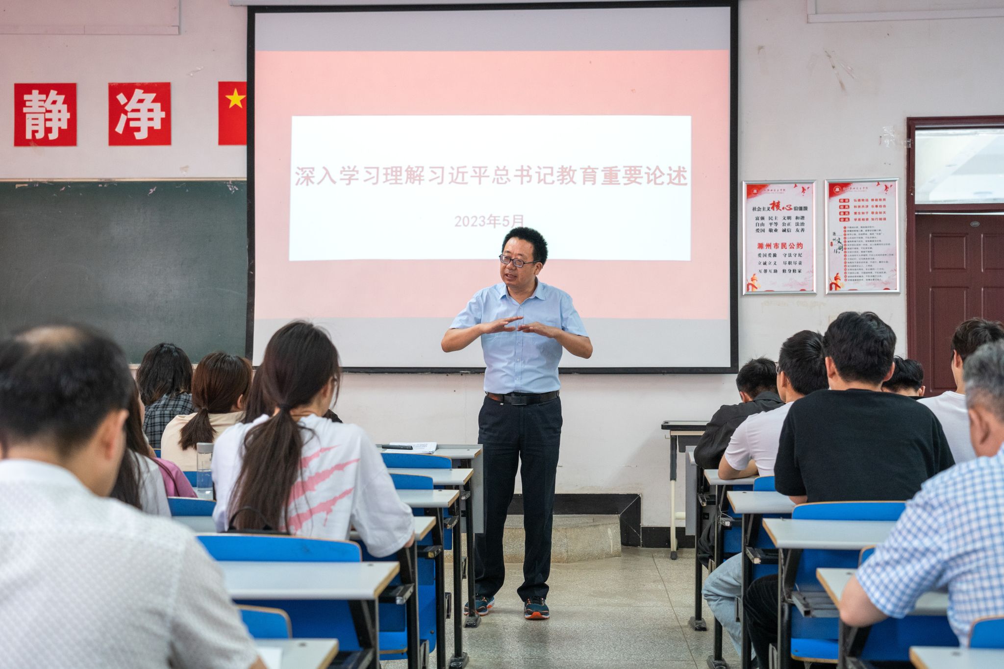 5月31日,校党委委员李平权在北阶104教室,为传媒与设计学院全体教师和学生代表作题为”深入学习理解习近平总书记教育重要论述”的专题宣讲报告,机关党总支第七党支部全体同志现场听取报告。