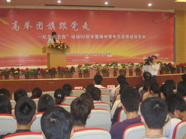 为隆重纪念“五四”运动92周年,5月4日下午,滁州市委宣传部、共青团滁州市委在滁州中学新校区大礼堂联合举办了“纪念‘五四’运动92周年暨滁州青年先进事迹报告会”。基础部团总支组织了50名团员青年代表亲临现场聆听了此次报告。