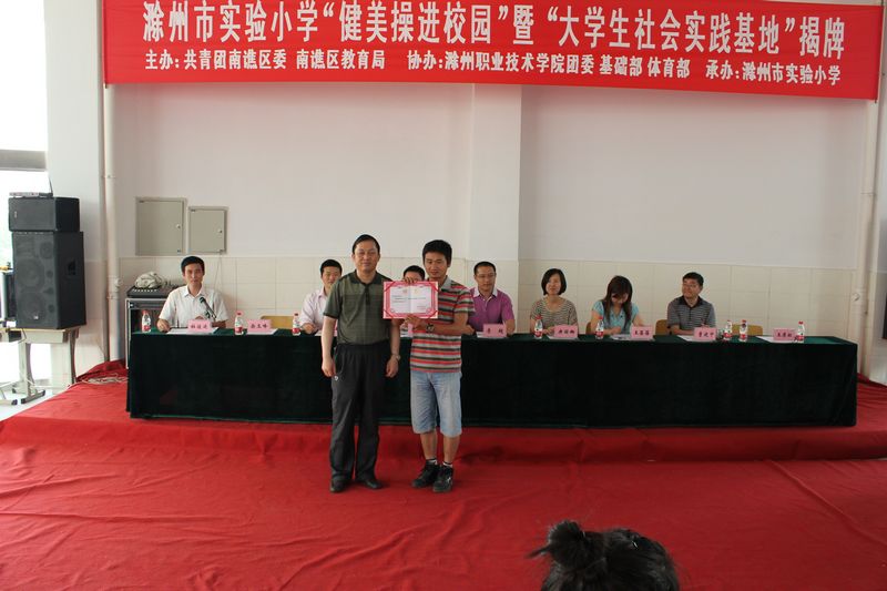 2012年5月10日下午,“金沙威尼斯欢乐娱人城大学生社会实践基地”暨“健美操进校园”揭牌活动在滁州市实验小学艺术楼报告厅隆重举行。共青团南谯区委张伟书记、院团委王蓓蓓书记、基础部党总支书记李超同志、院健美操协会指导教师王厚红同志、以及南谯区教育局和实验小学的领导共同参加了揭牌仪式。