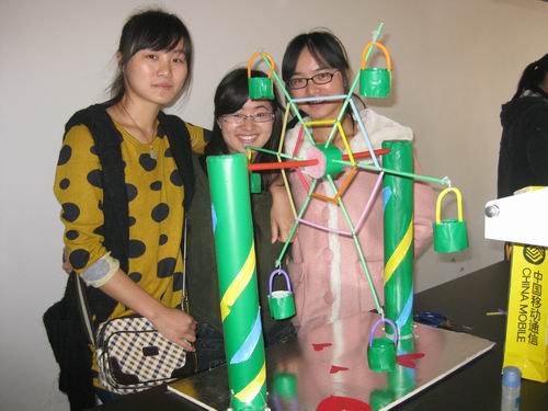 2011年11月20日上午,基础部第一届“废旧塑料工艺品创意设计大赛”如期在2212教室举行,并由基础部主任梁建军老师、艺术系工业设计教研室主任王起老师、基础部化工材料教研室主任周玲玲老师和专业课教师汪蓓蓓老师担当大赛评委。