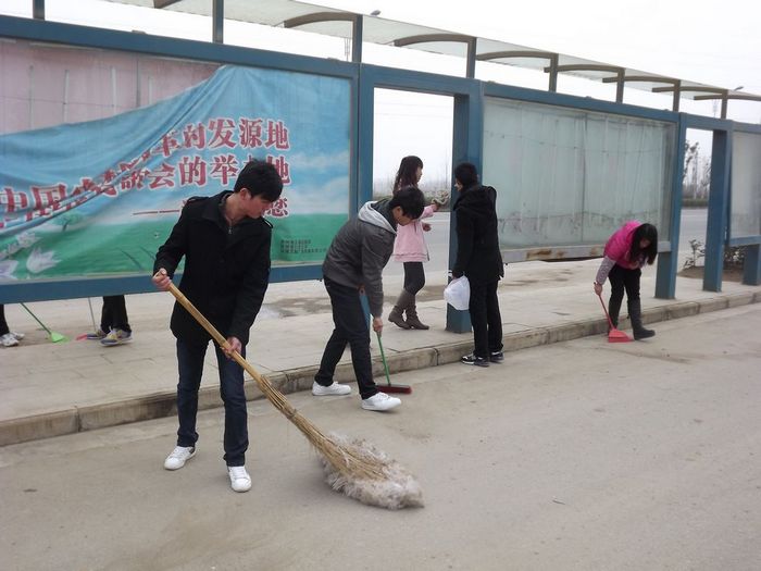 二队在学生会主席赵凯旋同学的带领下来到腰铺打扫天桥上下行公交车站牌,同学们扫地的扫地、擦站牌的擦站牌,井然有序,圆满完成任务。
