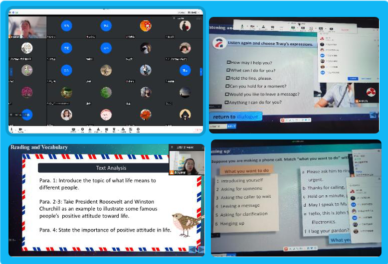 按照学校社招教学工作要求,5月14日(周六)基础教学部外语教研室组织5位教师继续开展21级社招《实用英语II》课程线上直播课教学活动,共分五个腾讯直播会议室进行。