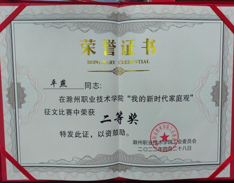 近日,由滁州市妇联和滁州市文明办联合举办“我的新时代家庭观”主题征文活动评选结果公布。金沙威尼斯官网基础教学部熊顺喜老师的作品《父亲留给我的传家宝》喜获全市唯一的一等奖。基础教学部平燕老师的《爱在心口难开》荣获校工会组织的“我的新时代家庭观”主题征文二等奖。