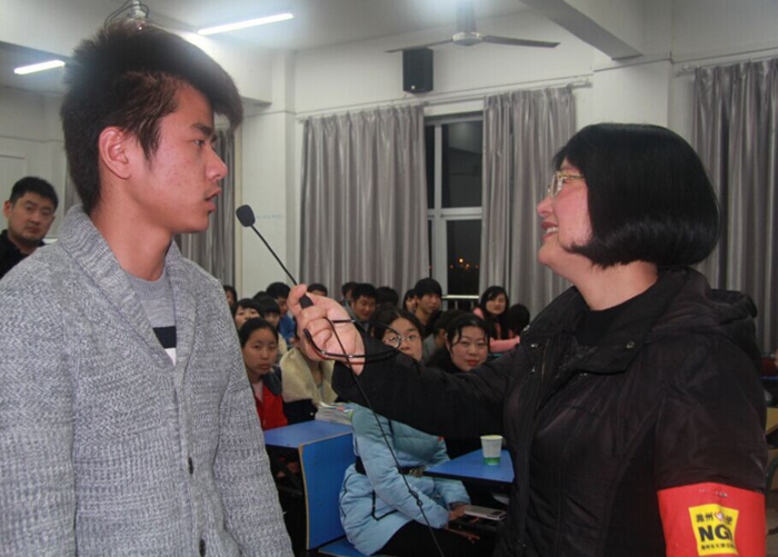 滁州市天使志愿者协会成立至今致力于环保、社会救助和无偿献血宣传,在册成员逾千人,均是来自滁州地区各行各业热心人士。2004年至今,该协会组织的社会救助先后募集善款200万多元,捐秋冬棉衣700多箱,救助特困群众679人。2014年,该组织荣获中华慈善总会第二届慈善突出贡献奖。蒋玮女士作为该协会的主要负责人,十余年间坚持做公益、积极组织并参与各类志愿服务。报告会上,她用质朴、感人又不失幽默的语言,与青年分享了她以“爱心、热心、公心、恒心、耐心、细心、精心、责任心”从事志愿服务的经历与收获,她和志愿者们的真诚和付出感动了在场的每一个人,场内一次次报以热烈的掌声。蒋玮女士还与学生们互动,共同探讨“如何成为一名合格的志愿者”的话题。
