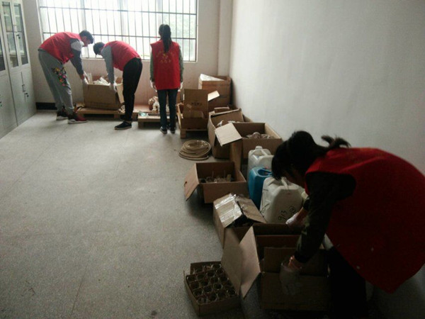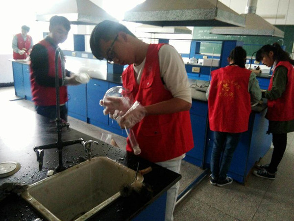 志愿者们来到指定实验室,整理出已损坏的实验仪器,并对部分玻璃器皿进行洗涤。大家分工明确,有条不絮的进行,每个人都很认真积极的工作。清洁完毕后,志愿者们又细致的对实验室中药品进行摆放。辛苦的劳动,换来的是实验室整洁的面容。看着自己的劳动成果,每个志愿者的心里都无比的满足。