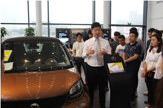 在杨靖老师的带领下,同学们有序的进店参观。参观过程中,由销售总监张经理及人事主管吴经理全程给予讲解,大家带着饱满的热情认真聆听,虚心请教。同时,在吴经理的安排下,每位同学都亲自体验了奔驰各款车型的乘坐舒适性,感受了奔驰汽车扎实的造车功底及前沿设计水平。