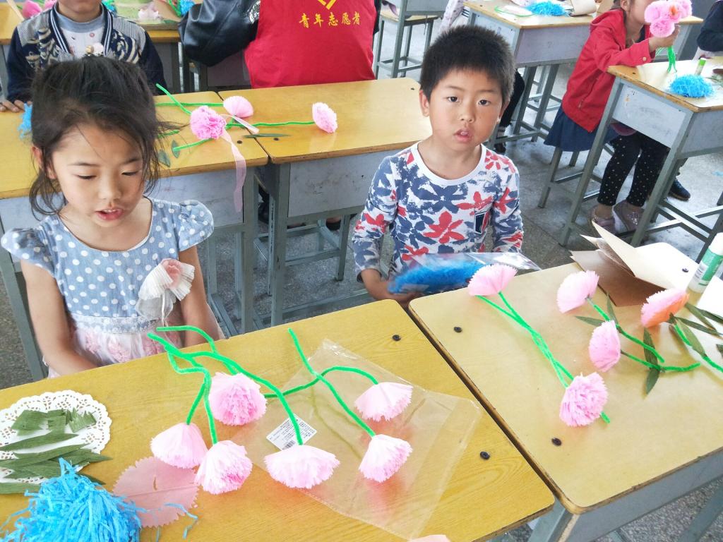 有一个方向叫做期盼,妈妈说过她就在北边,有一种笑容叫惊喜,妈妈说她今年过年回家。本次活动中的留守儿童给每一位志愿者留下来深深的印象,一位可爱的小姑娘对志愿者说:“姐姐,我能把这么美丽的花送给奶奶吗?我的妈妈出去打工了,但是她答应我六一一定回来看我,”另一位小姑娘说:“姐姐,什么是母亲节?母亲节妈妈会回来吗?”听着孩子们问题,志愿者们沉默了,紧接着志愿者们收起内心的难过,带着笑容鼓励和照顾小朋友们一起完成今天的手工制作。